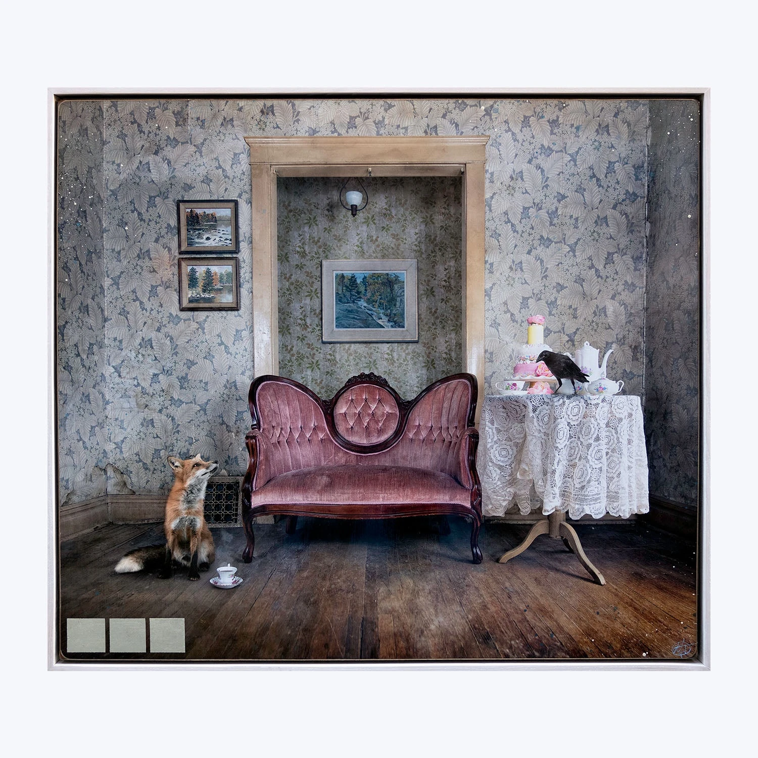 A Voice So Sweet #2 is a whimsical fantasy of a particularly peculiar scene starring a crow and a fox sharing tea and cake in a Victorian-style parlor. Medium: Photography & Mixed-Media on Wood Panel with Painted Ash Wood Frame