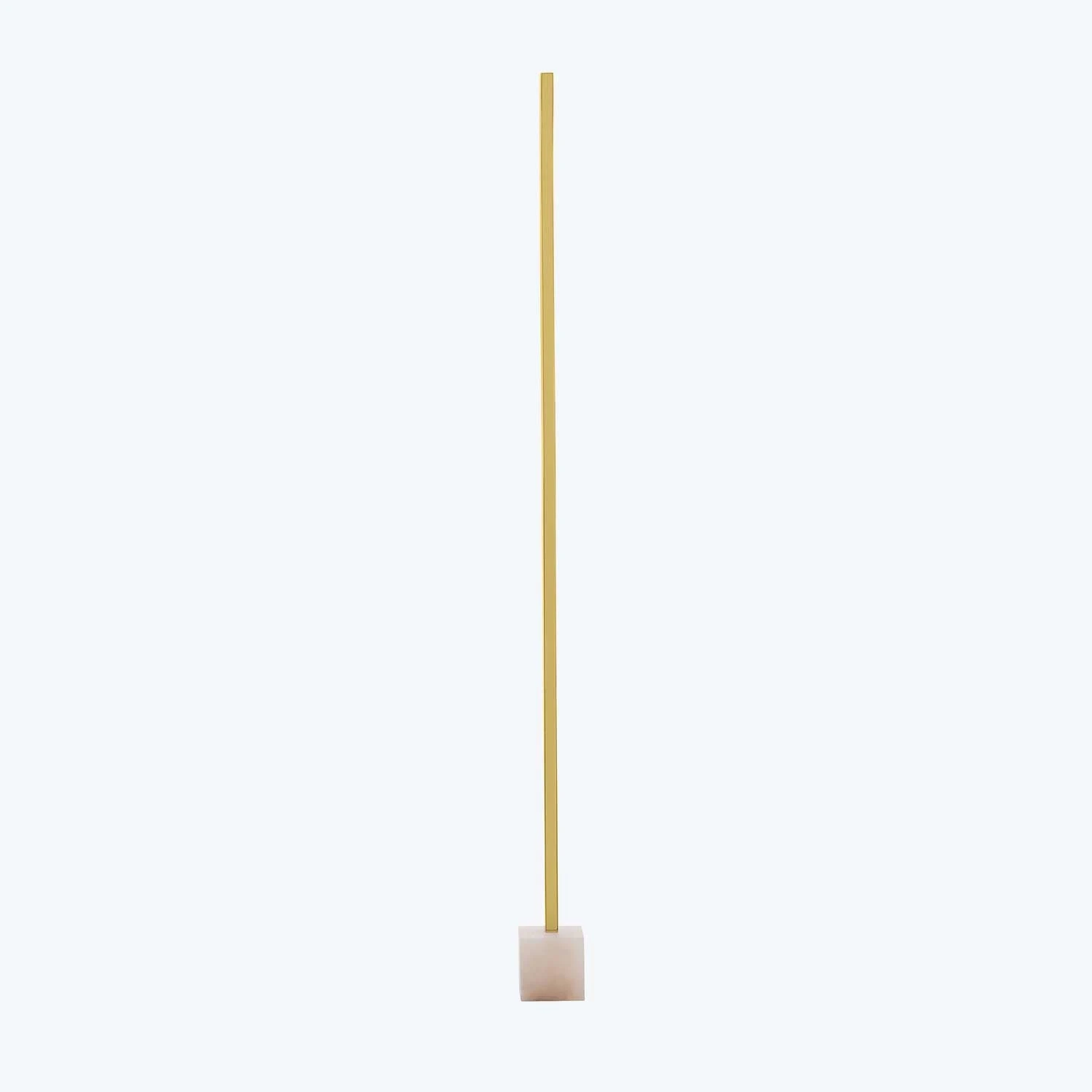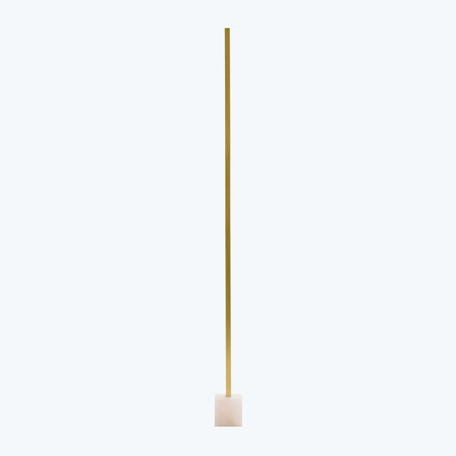 The elegance of simplicity defines this lamp with a slim silhouette and refined materials. The architectural design is constructed of an antique brass iron frame and a white alabaster base. An LED strip is concealed by the attenuated iron frame, An LED strip is concealed by the attenuated iron frame, creating an ambient glow illuminated by backlight through a white acrylic diffuser. Finish will vary.