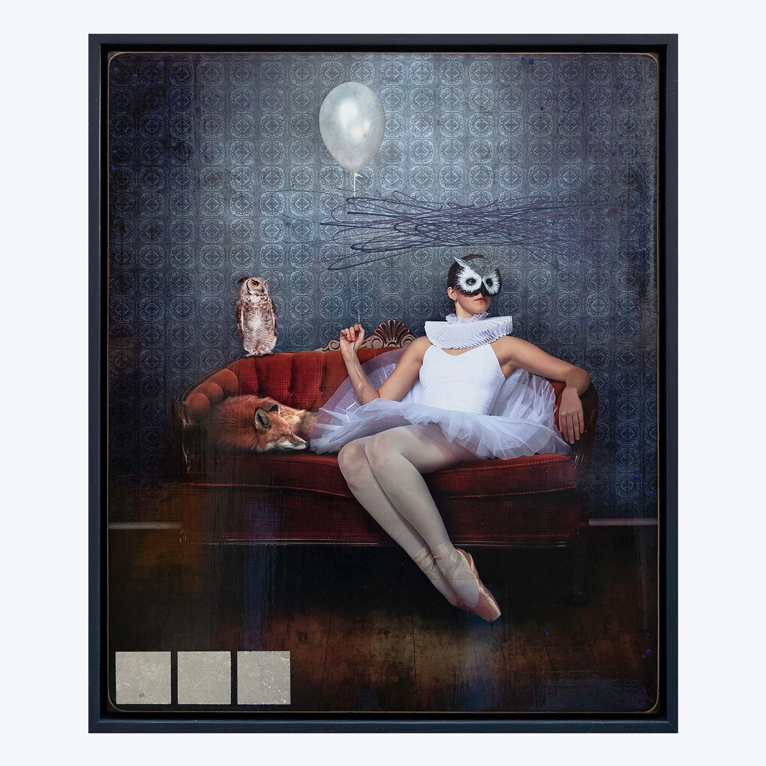 Birds of a Feather from the Masked Collection features whimsical elements including a masked ballerina, peering owl, and sleeping fox. Medium: Photography & Mixed-Media on Wood Panel with Painted Ash Wood Frame