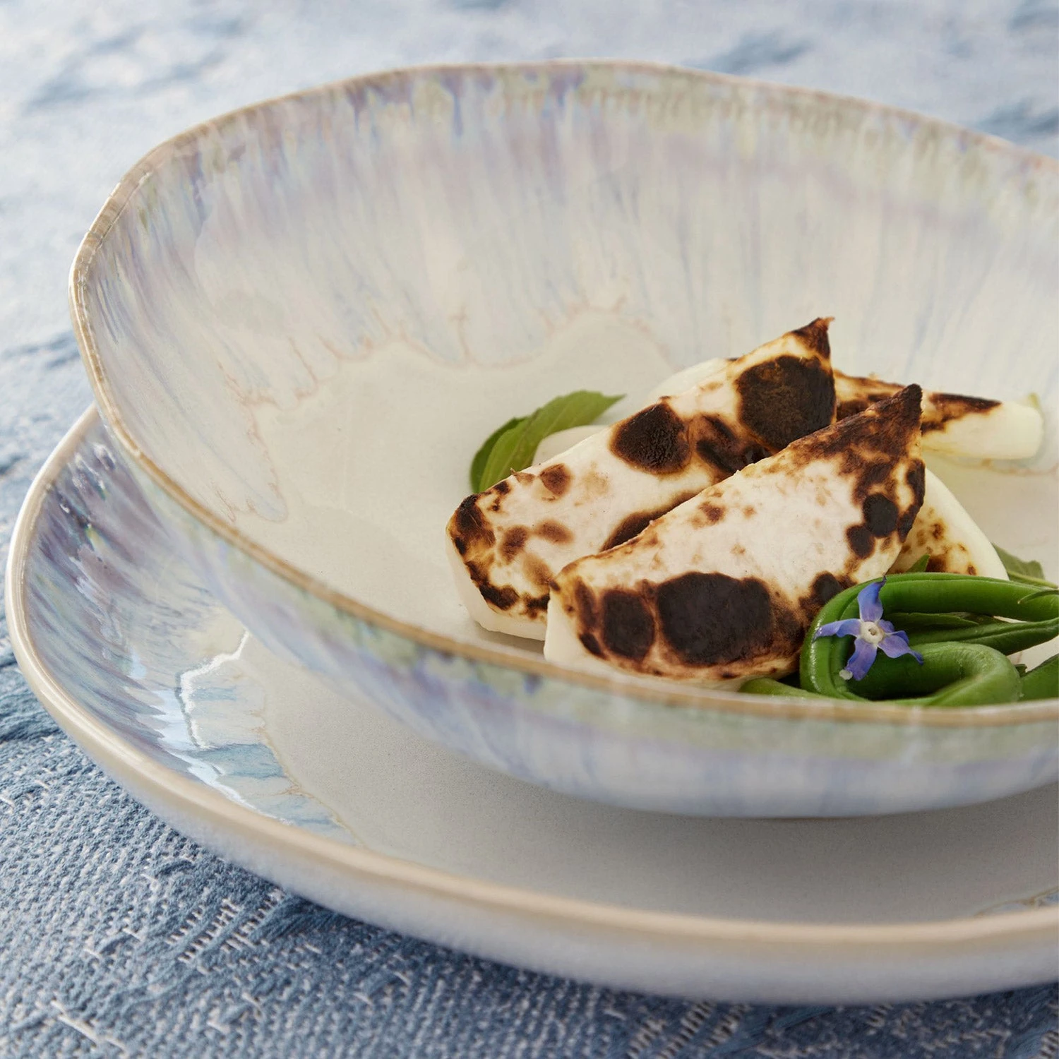 Made in Portugal, this Brisa Serving Bowl features a distinctive coastal style that adds light to your meal. The Brisa Collection transports us to the landscape of lagoons and sandy beaches stretching across deserted islands with its milky blend of white and blue glazes.