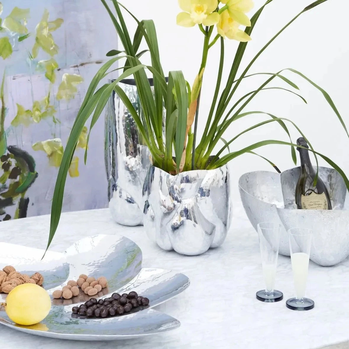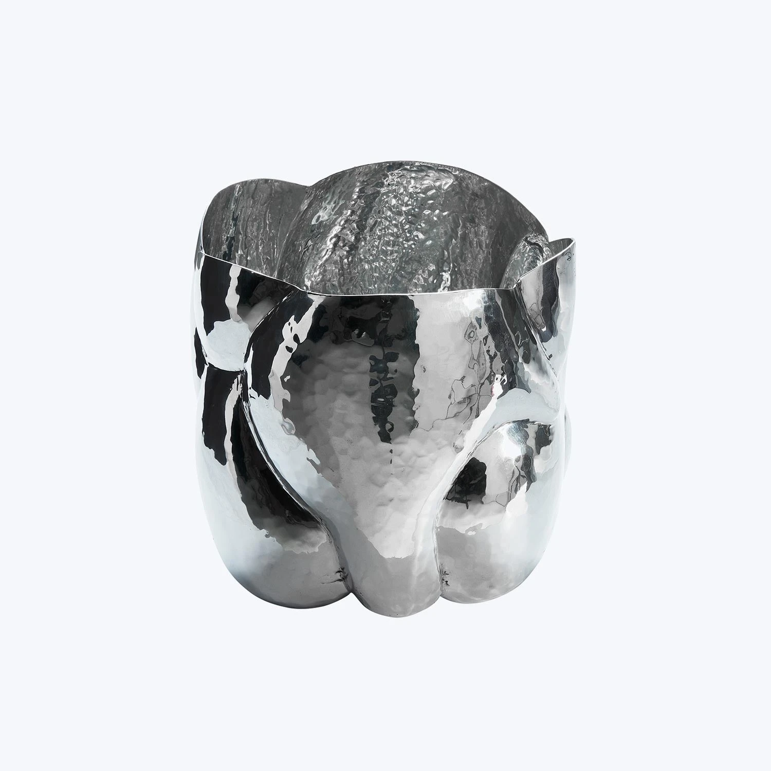 Cloud is a sculptural vessel made of highly reflective polished aluminum. Handmade in India by skilled artisans, each vase has unique qualities with every hammer and indentation from stretching and warping the metal being preserved, reflecting the amount of work thats gone into the design. This silver decorative vessel serves as an exquisite flower vase, fruit bowl, or contemporary sculpture. Layer your mantel, dresser, or table in luxury with the Cloud Vessel – Short.