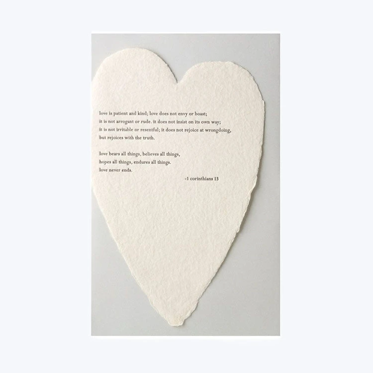 Pair your gift with this darling Corinthians Heart Card. Features ink on a letterpress printed folded card on full-deckled cream heart handmade paper from 100% recycled cotton with light grey envelope. Blank inside with 1 Corinthians 13 on the exterior. Made in Portland, Oregon.