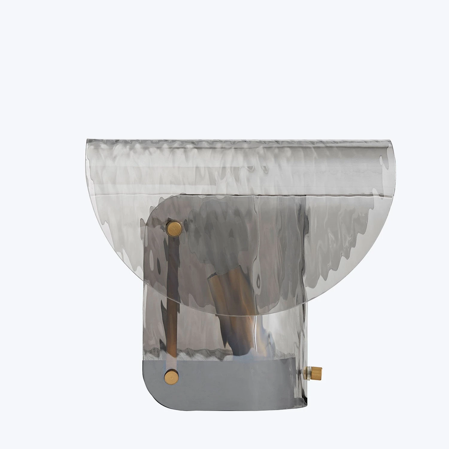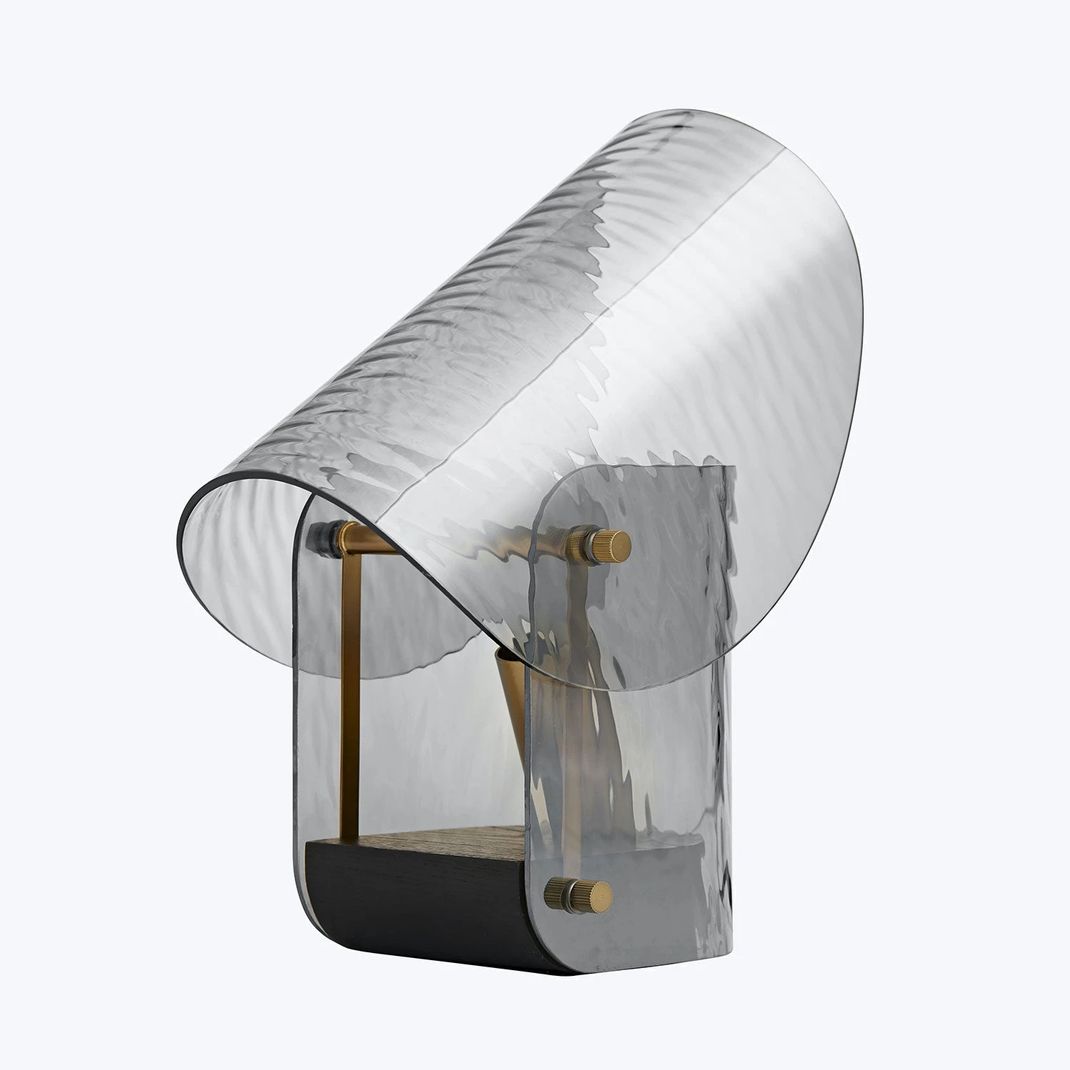 Composed of two curved, textured smoke glass forms, this lamp makes a big statement despite its petite size. The lamp’s shade can be adjusted to tilt in either direction, directing its delicately patterned light wherever you desire.