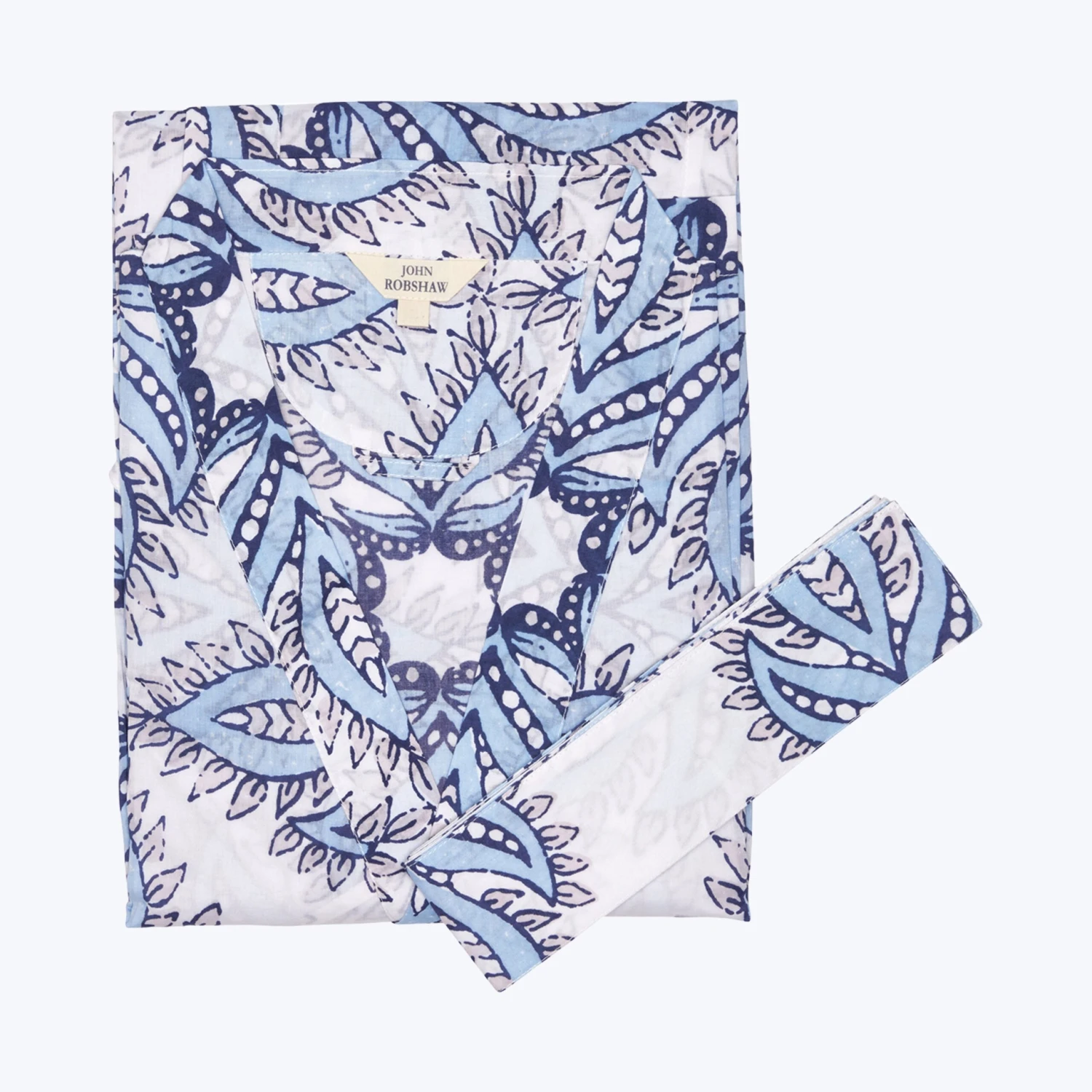 The Daru Robe is made from cotton voile for an incredibly soft and lightweight feel. Perfect for any season, it features a delicate design in blue. Featuring a distinct balance of bold and bright from old-world traditions and new-world style, John Robshaw displays an updated spin on traditional, handmade textiles with a vibrant mix of sophistication and romantic allure. Dying, printing, and experimenting alongside the artisans to create these unique fabrics, John Robshaw helps preserve traditional block printing, hand-stitching, hand-painting, and hand-quilting textiles in India.