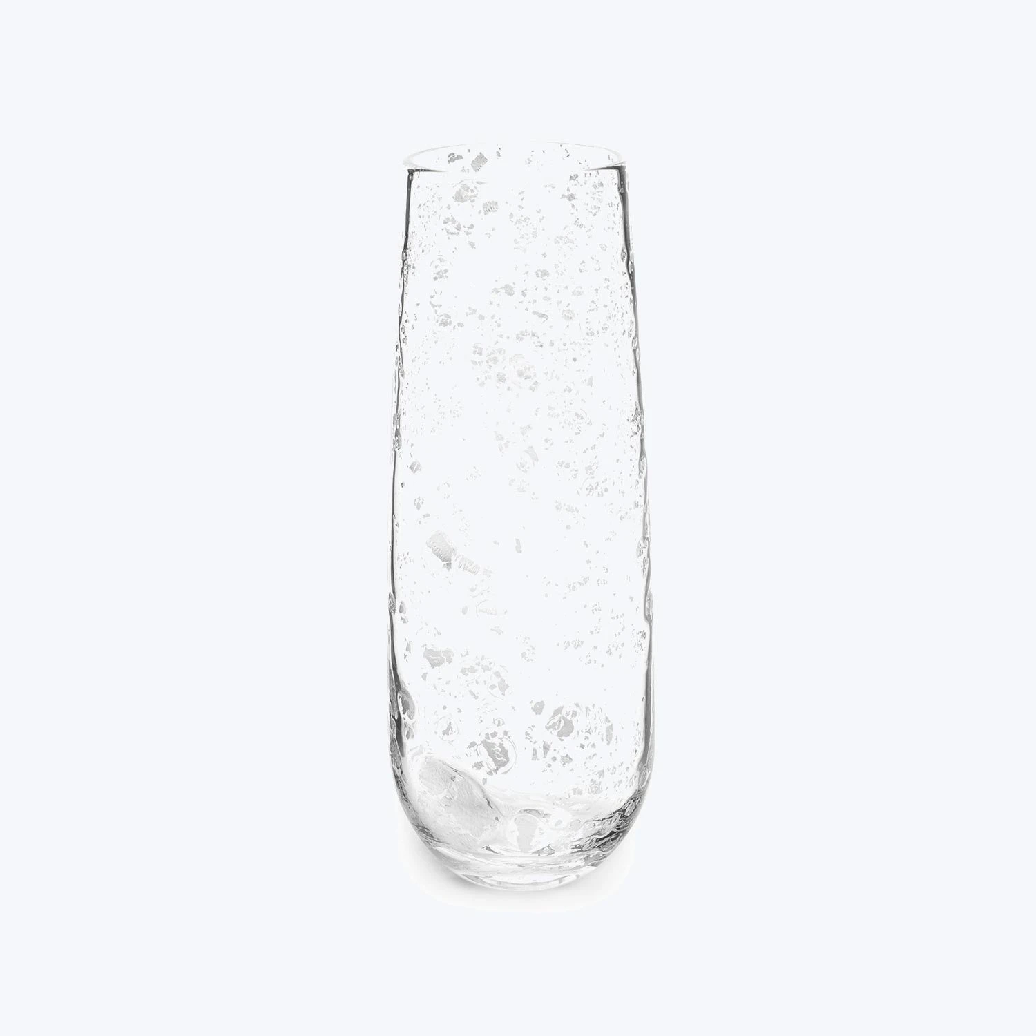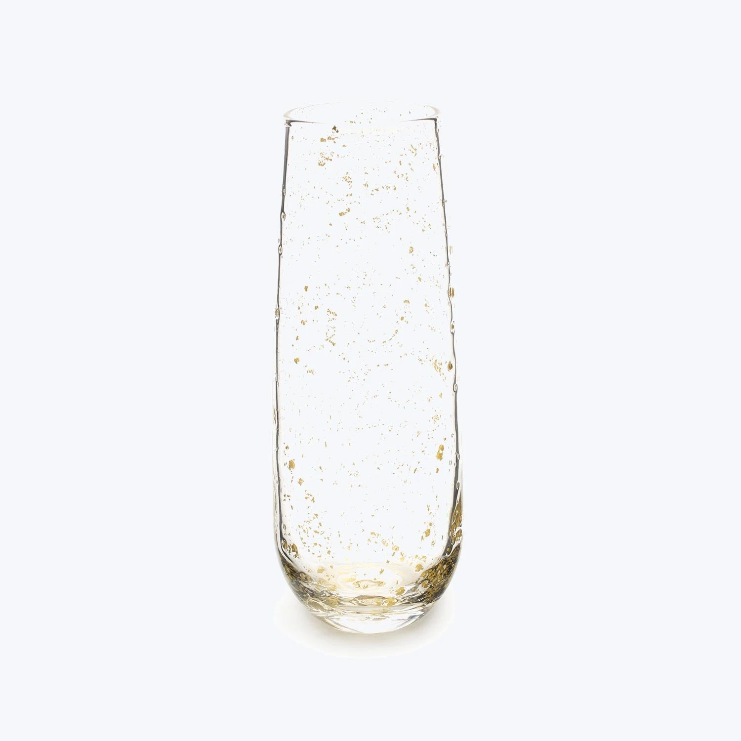 The handmade champagne flute features 24-karat gold or 100% silver flakes safely encased between 2 layers of glass. The traditional flute shaped bowl preserves bubbles to make the celebration last longer, while the modern stemless shape makes them easy to store.