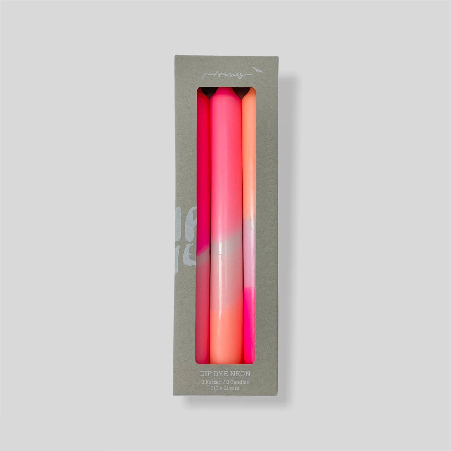 Brighten up your entryway or dinner party table setting with this set of 3 hand-dyed neon taper candles. Pink Stories Candles are handmade, making each color the same but every pattern special and unique. Dyed in cooperation with social institutions in the beautiful foothills of the Alps. 100% Vegan.