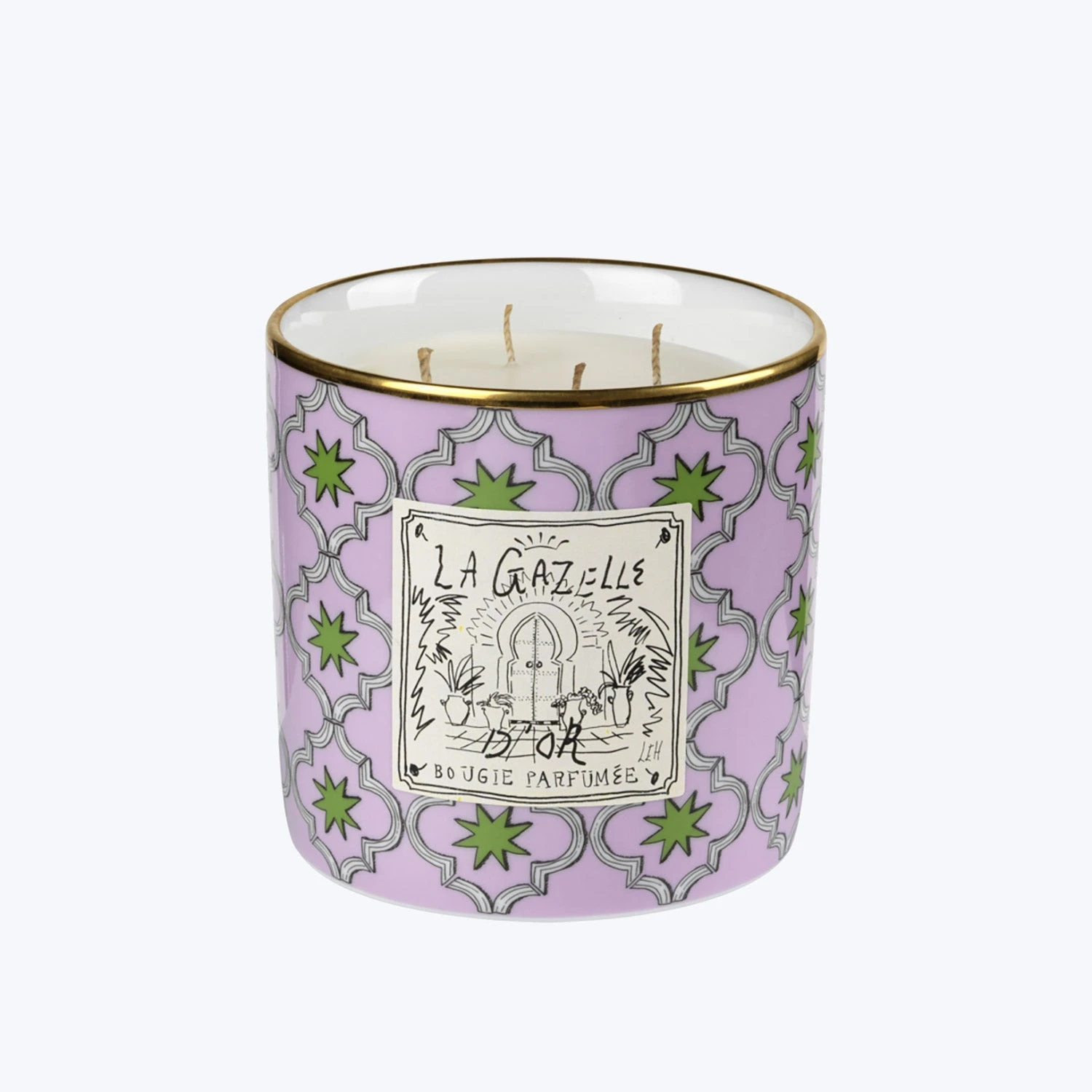 The La Gazelle D’Or designer scented candle features top notes of spearmint with heart notes of rose, geranium, and green tea followed by long-lasting base notes of cedarwood, musk, and white moss.