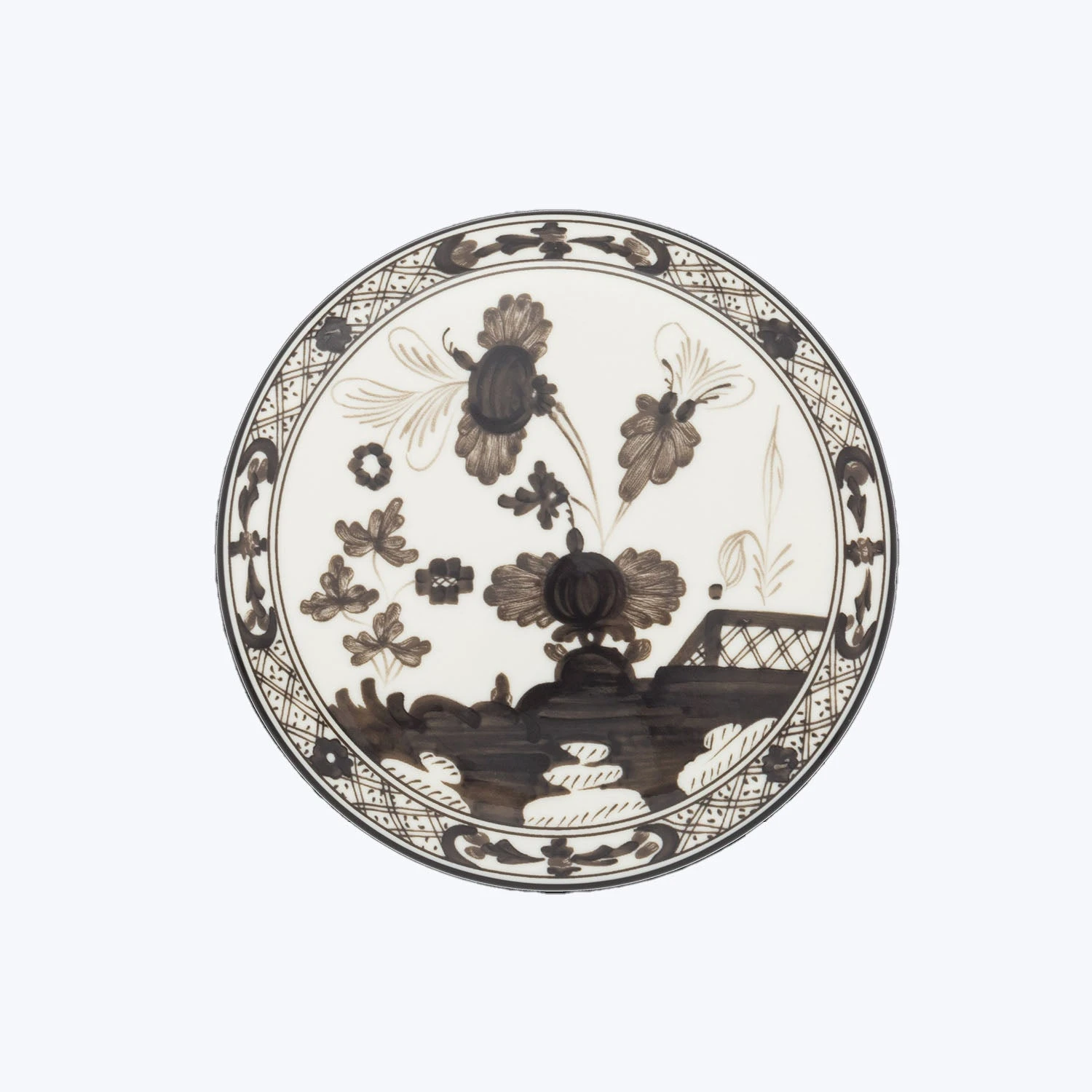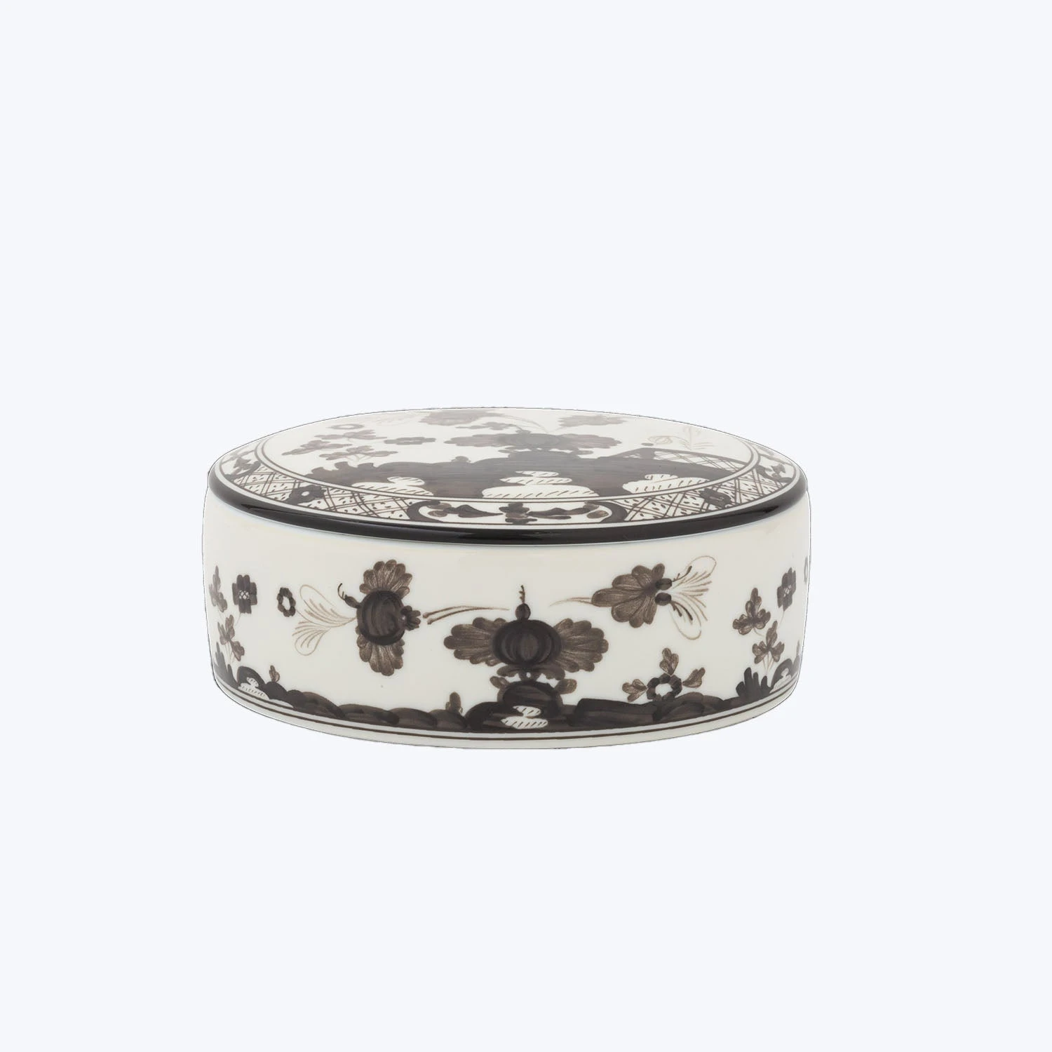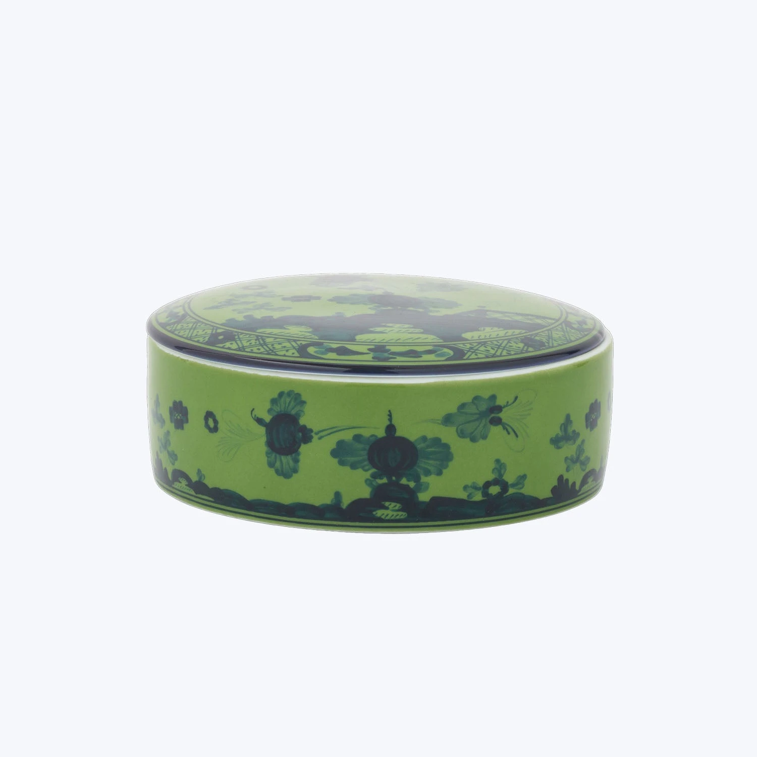This Oriente Round Box with Cover is a stunning piece of porcelain dinnerware from Ginori 1735 that’s not only a work of art but also a piece of history – the atelier of expert artisans was founded in the 18th century, merging timeless elegance with beautiful craftsmanship. Full of lovely details and striking color, this round box with cover brings a touch of wonder to your decor assortment. Available in an assortment of colors; Azalea, Albus, Iris Gold, Malachite and Pervinca.