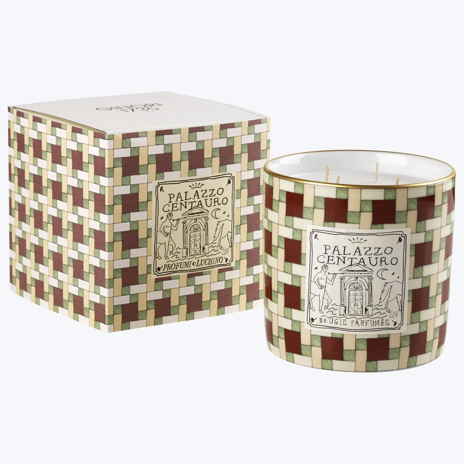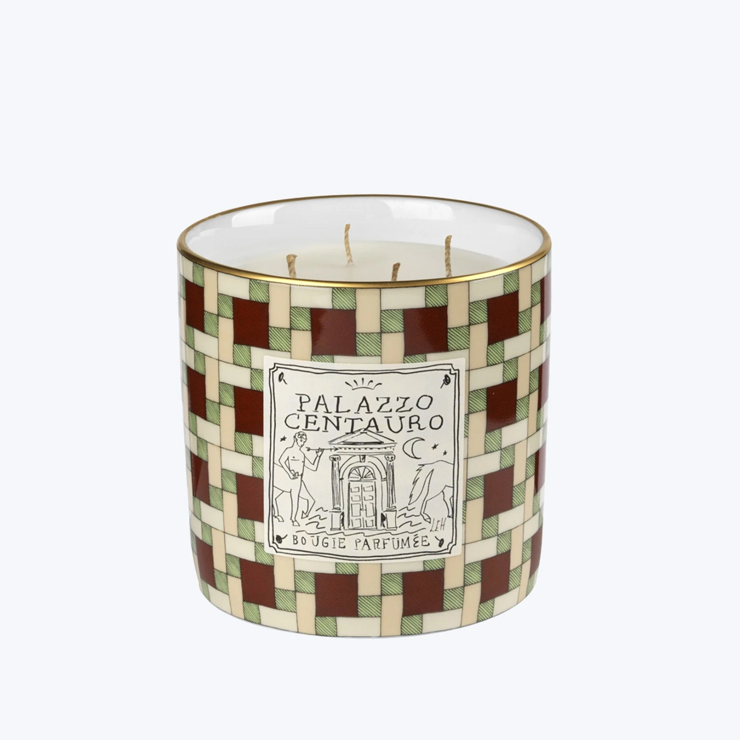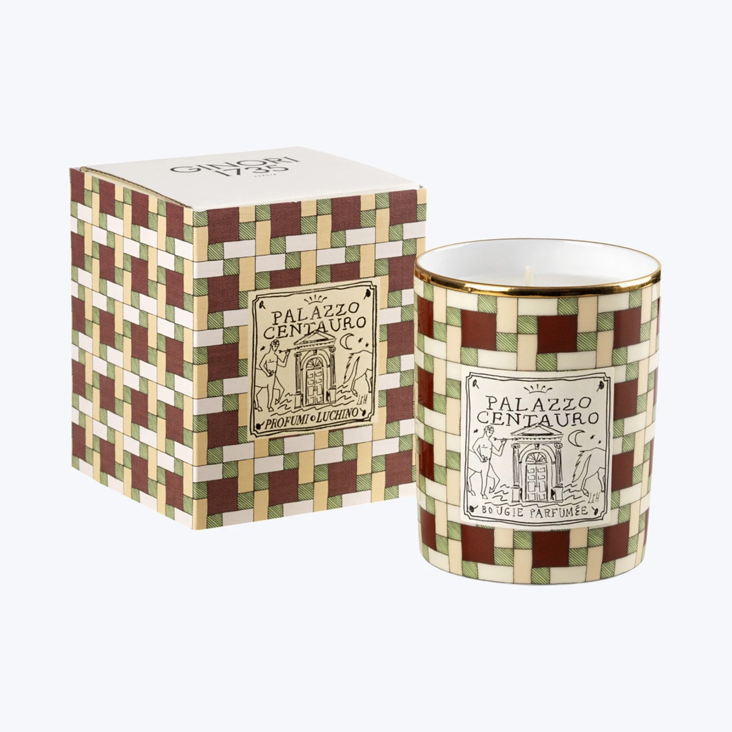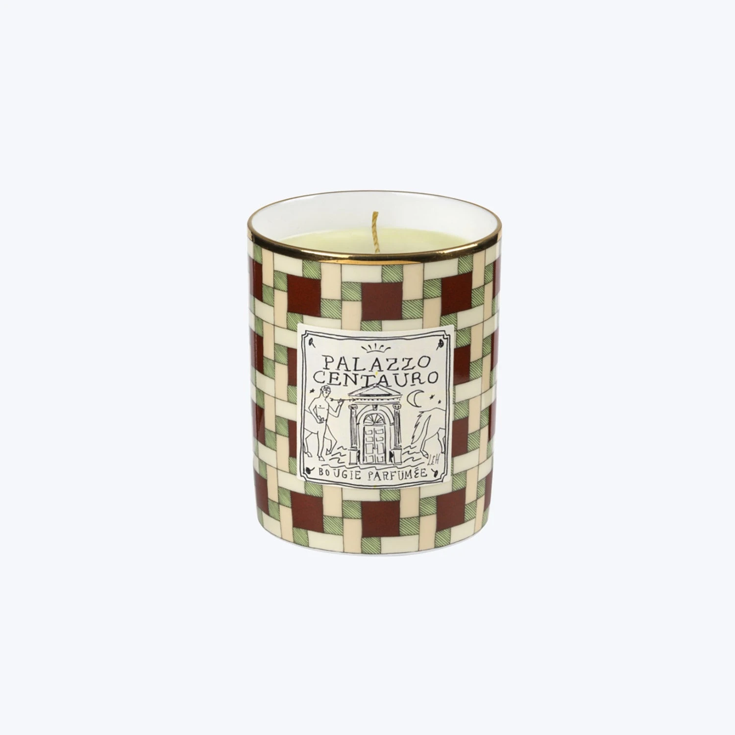 The Palazzo Centauro designer scented candle features top notes of Italian bergamot with heart notes of olibanum and elemi followed by long-lasting base notes of cedarwood, birch tar, and patchouli.