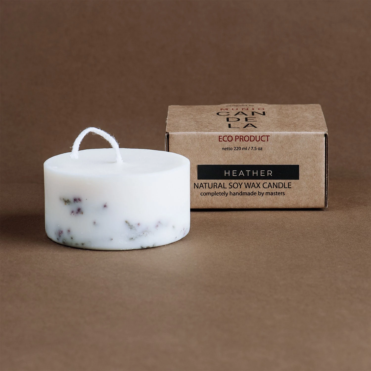Fragrance: Heather | Volume: 220 ml | Dimensions: 8 cm x H 4 cm | Burn Time: 15h