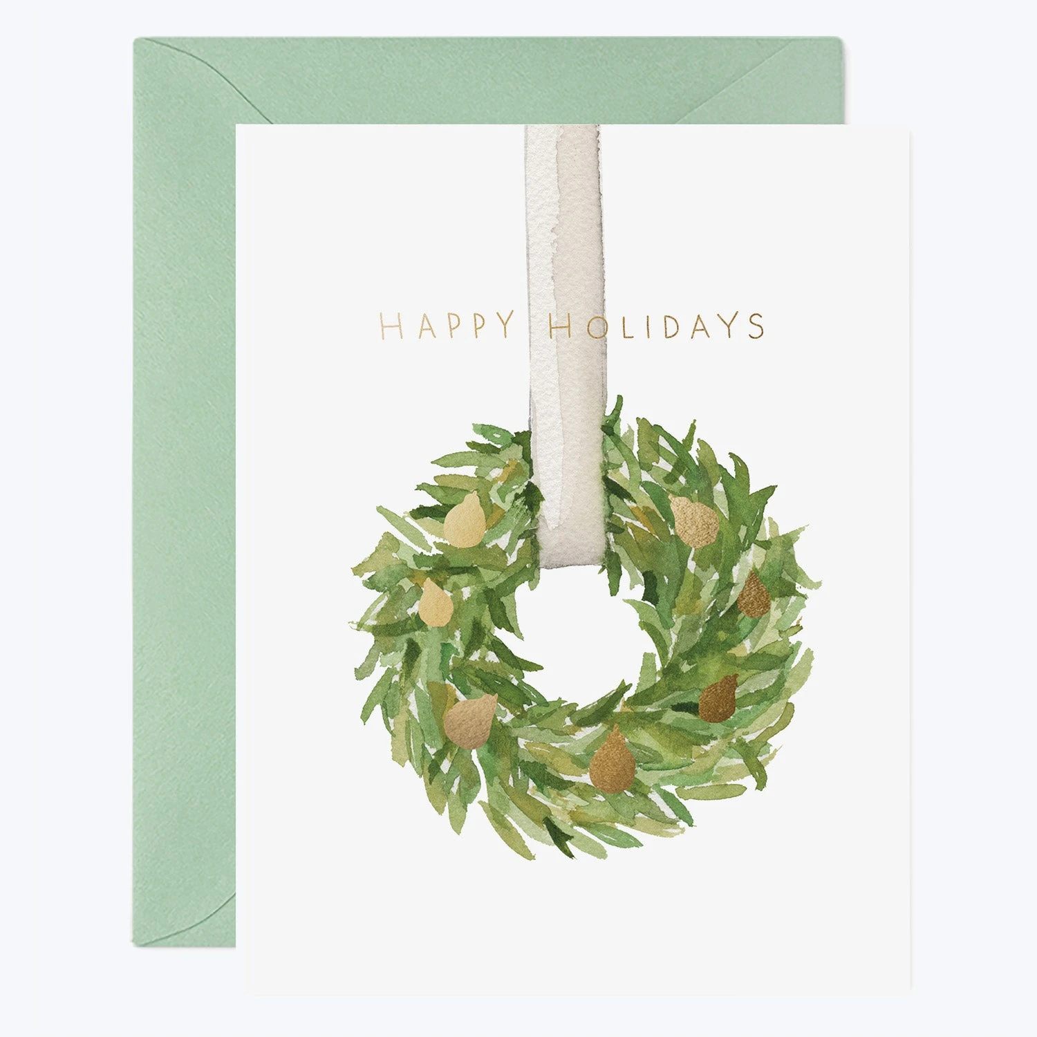 Spread the holiday cheer with this Holiday Wreath Card. Made in the USA, each E.Frances card begins as an original watercolor painting that is then printed in brilliant color on luxe, heavyweight paper and finished with gold foil. Blank interior with colorful envelope to match.