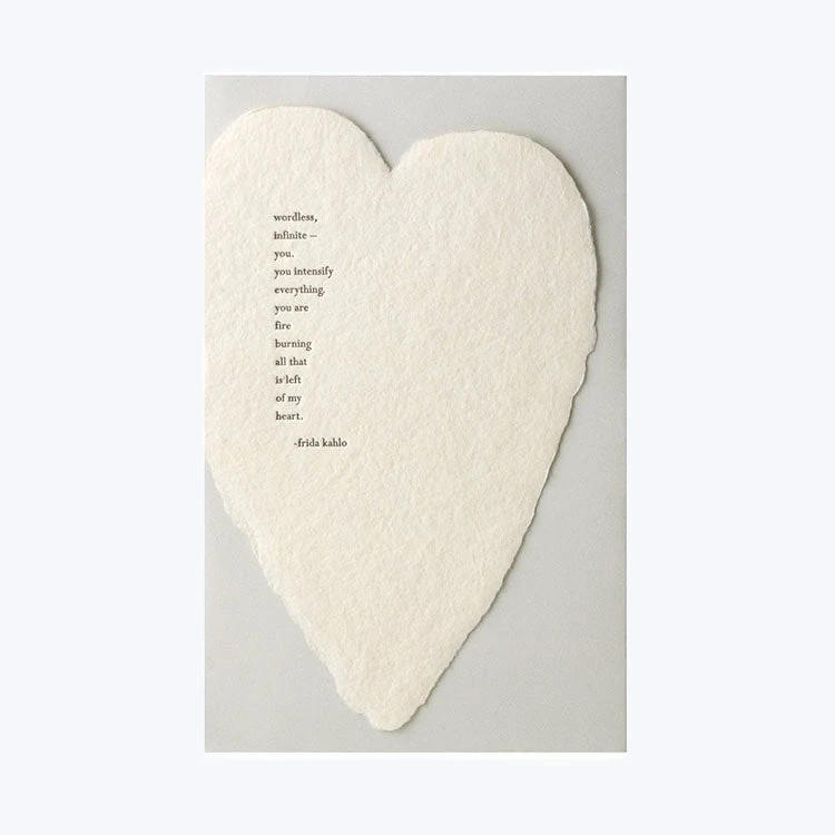 Pair your gift with this darling Kahlo Poetry Heart Card. Features ink on a letterpress printed folded card on full-deckled cream heart handmade paper from 100% recycled cotton with light grey envelope. Blank inside with Frida Kahlo poem on the exterior. Made in Portland, Oregon.