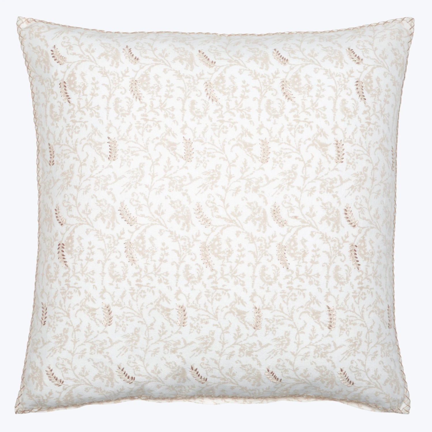 This Madhavi Pillow features a soft jungle toile in a neutral color palette. Beautifully block printed by hand, super soft, on a blend of cotton and linen with hand stitched edging. Created using traditional block printing methods of hand-carved blocks from teak tree trunks, hand-mixing dye to create the perfect colors, and block printing with extreme precision to perfectly align all the unique motifs within this textile.