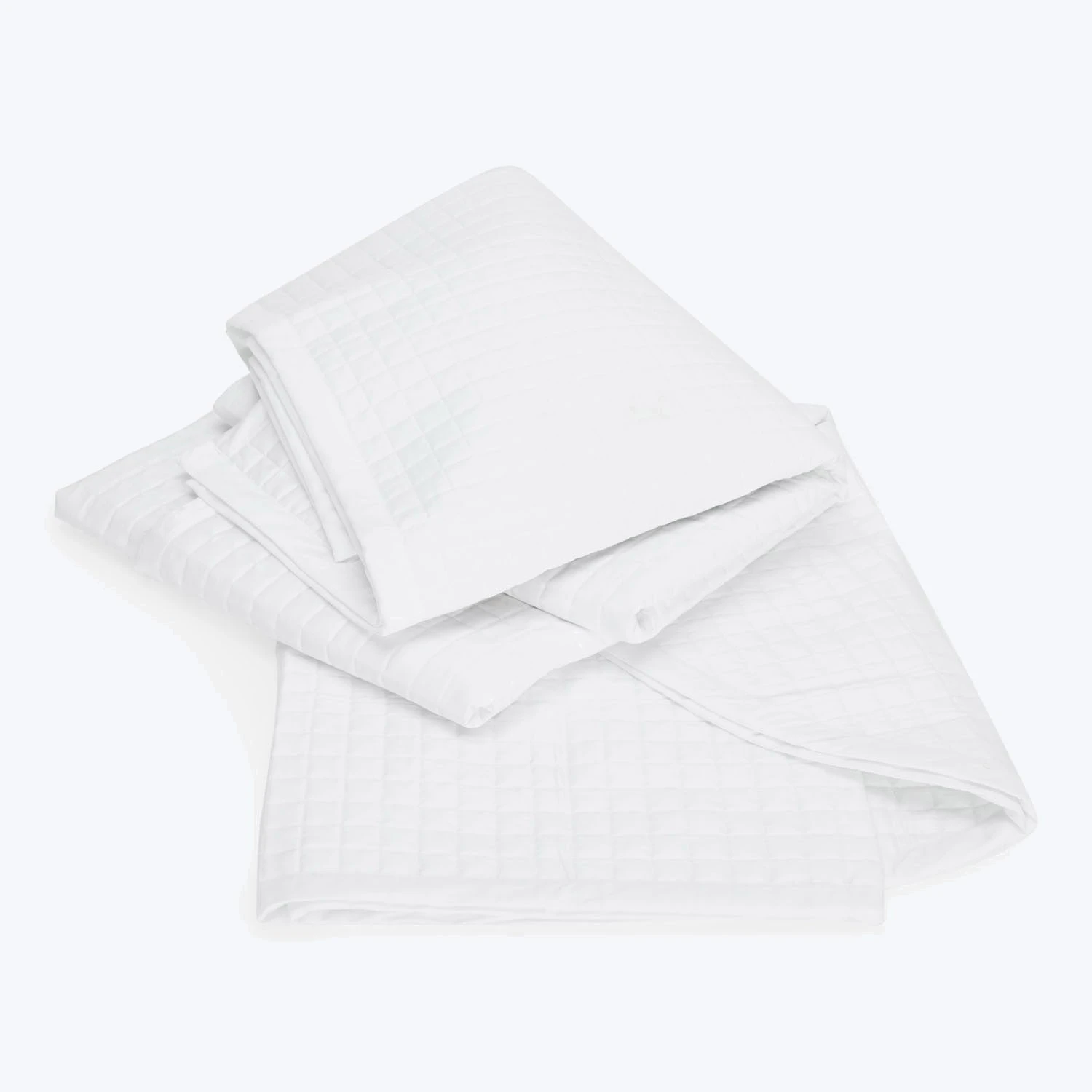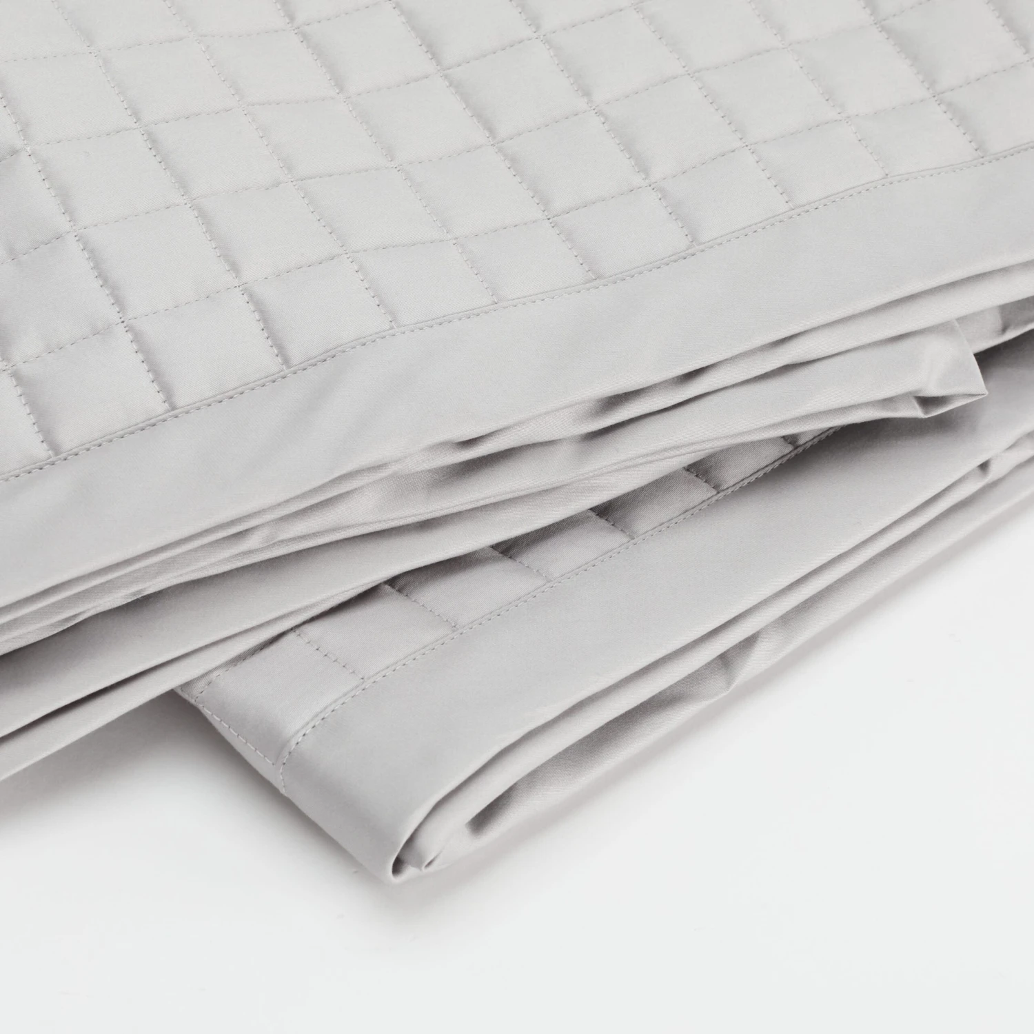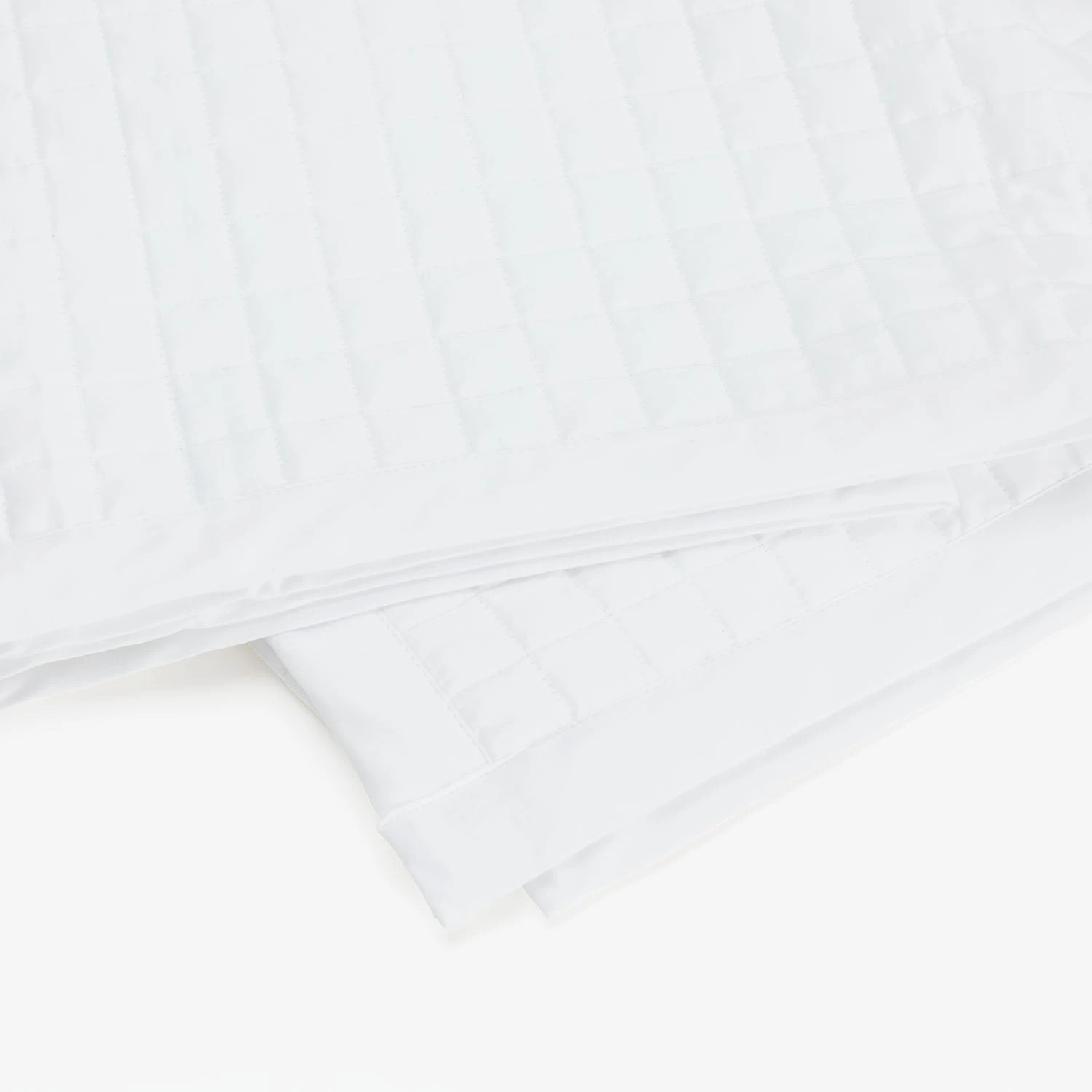 Soft, warm, light, colorful, and extremely durable, this quilted coverlet reverses to a solid percale with rounded corners and is finished with an elegant plain sateen border in coordinating color. Made in Italy.