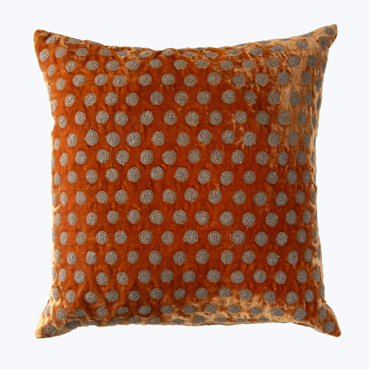 The Medal Pillow is a stunning decorative pillow from India. Its vibrant color background is adorned with circular metallic designs. Made with 100% Silk Velvet, this 18 L x 18 W pillow showcases a plush texture and exceptional quality. Elevate your home decor with this exquisite decorative pillow.