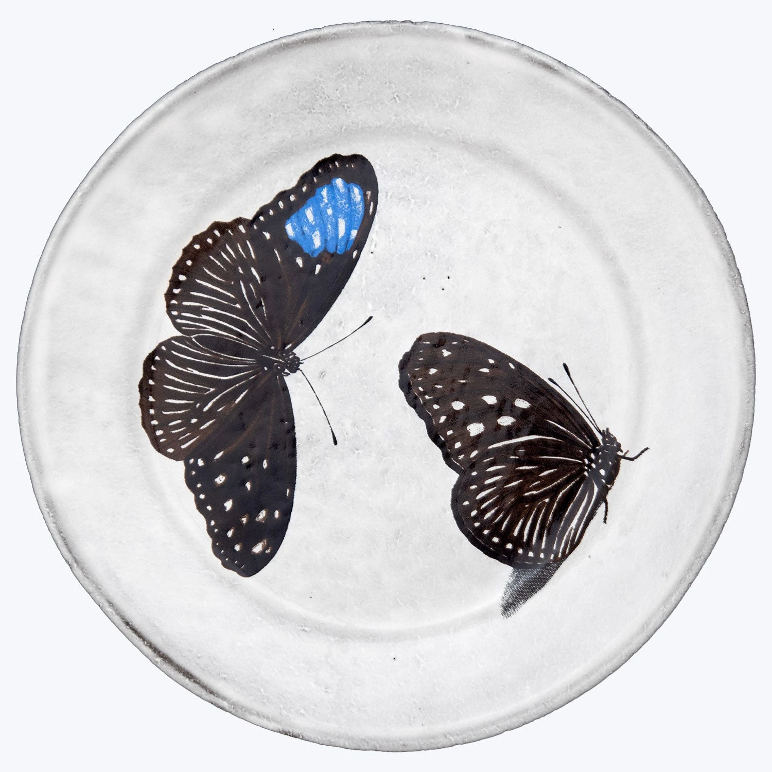 Emblazoned with the iconic work of decoupage artist John Derian, this Medium Flying-Landed Butterflies Plate showcases the visually stimulating beauty of nature through the colorful imagery of two butterflies. Handmade on the Rue St. Honore in Paris, these 18th-century-inspired ceramics are crafted in a traditional pottery style passed down from generation to generation. Hand-molded from black terracotta, each piece is finished in a milky-white glaze that highlights the unique character of the clay, celebrating its imperfections and ensuring that no two pieces are exactly alike.