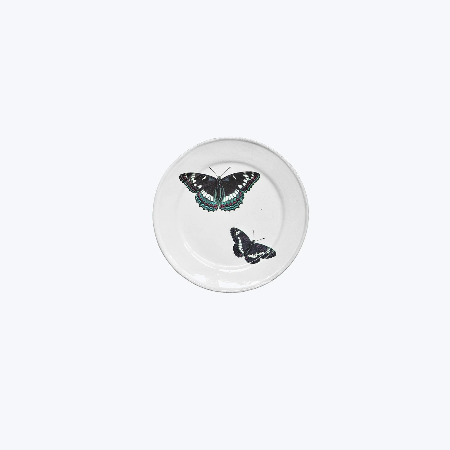 Emblazoned with the iconic work of decoupage artist John Derian, this Medium Two Flying Butterflies Plate showcases the visually stimulating beauty of nature through the colorful imagery of two butterflies midflight. Handmade on the Rue St. Honore in Paris, these 18th-century-inspired ceramics are crafted in a traditional pottery style passed down from generation to generation. Hand-molded from black terracotta, each piece is finished in a milky-white glaze that highlights the unique character of the clay, celebrating its imperfections and ensuring that no two pieces are exactly alike.