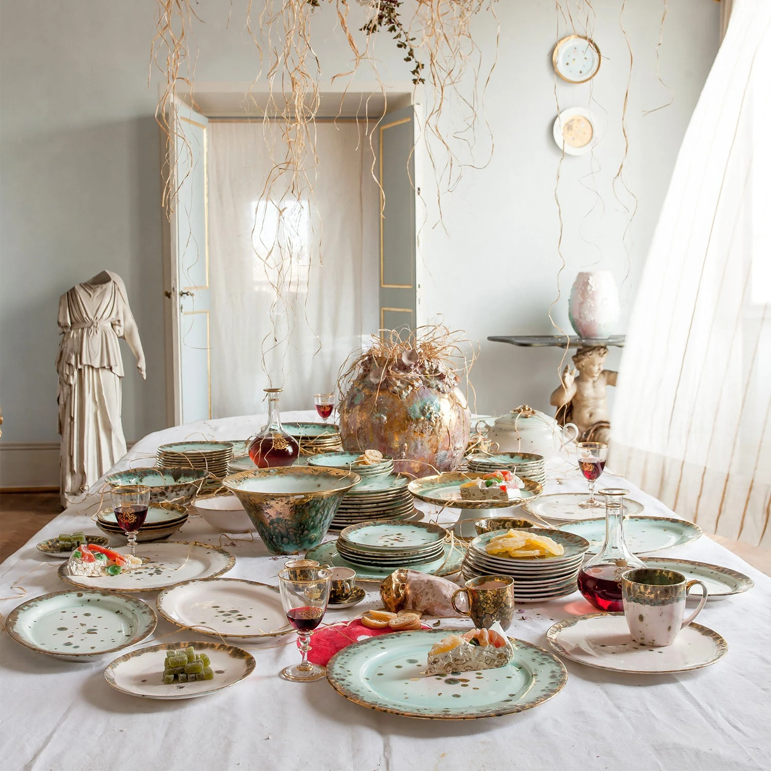 Material and earthy like the great Renaissance Master’s work, the Michelangelo Chubby Mug conveys classical beauty and elegance with its light pink interior, golden and green exterior, and golden handle. Unique, elegant, and whimsical, the Michelangelo Porcelain Dinnerware Collection brings poetic color to your table with a touch of regal elegance. Originating from Italy, Coralla Maiuri is a world-renowned artist who creates hand-crafted dinnerware and home decor inspired by natural elements.