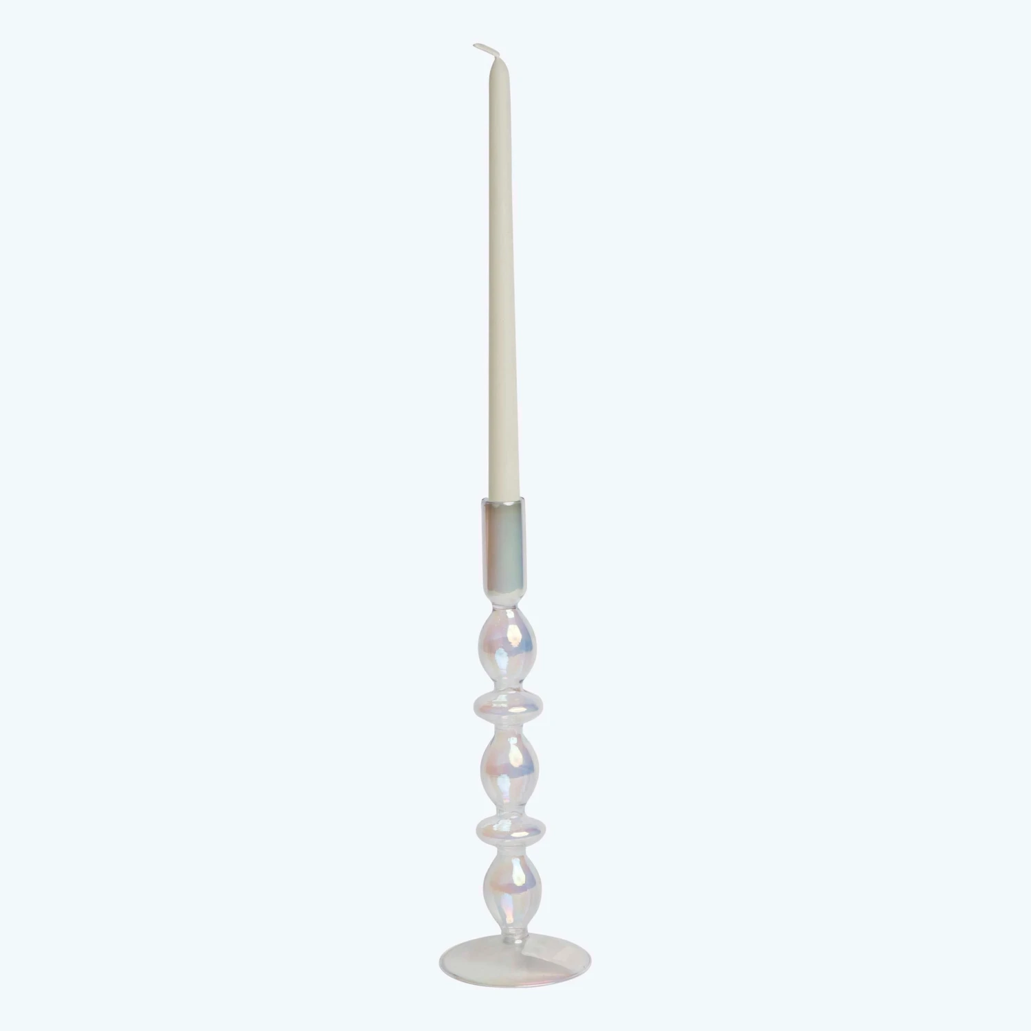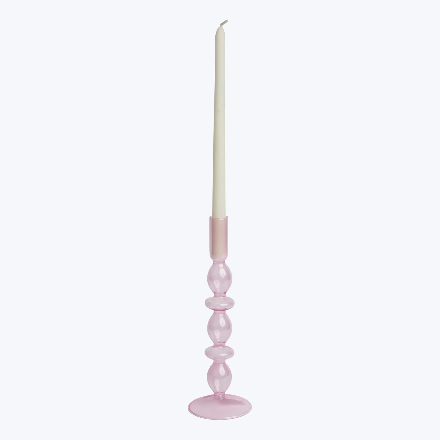 This Ornamental Glass Candlestick pairs perfectly with enchanting table settings for every season. This glass taper candlestick is blown in a sophisticated bubble shape with a colorful tint. A beautiful addition to your bookshelf, coffee table, or entryway display.