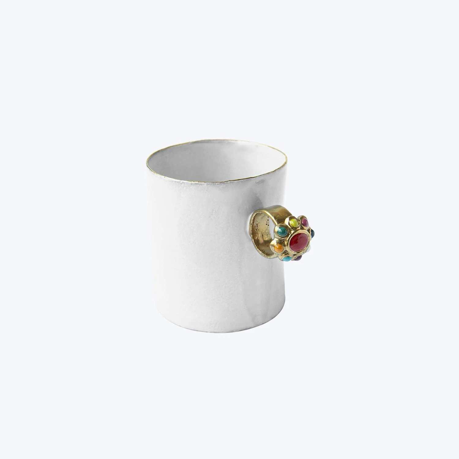 This Red-Multicolor Ring cup is a one-of-a-kind ceramic object born out of the collaboration between artist John Derian & Parisian-based ceramic studio Astier de Villatte. Hand-molded from black terracotta and finished in a milky-white glaze and finished with the sculpted creative flare of artist John Derian. Handmade in the ceramic studio of Astier de Villatte in Paris.