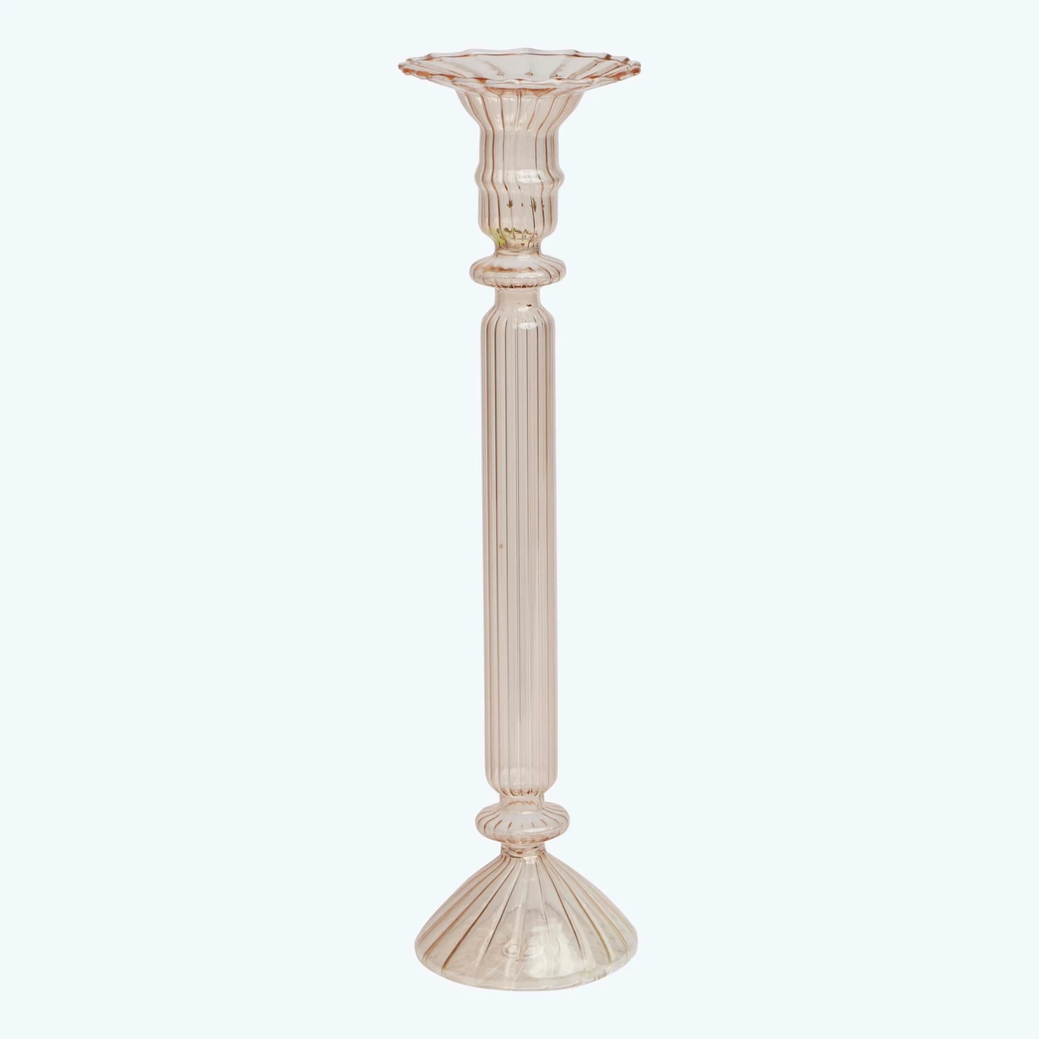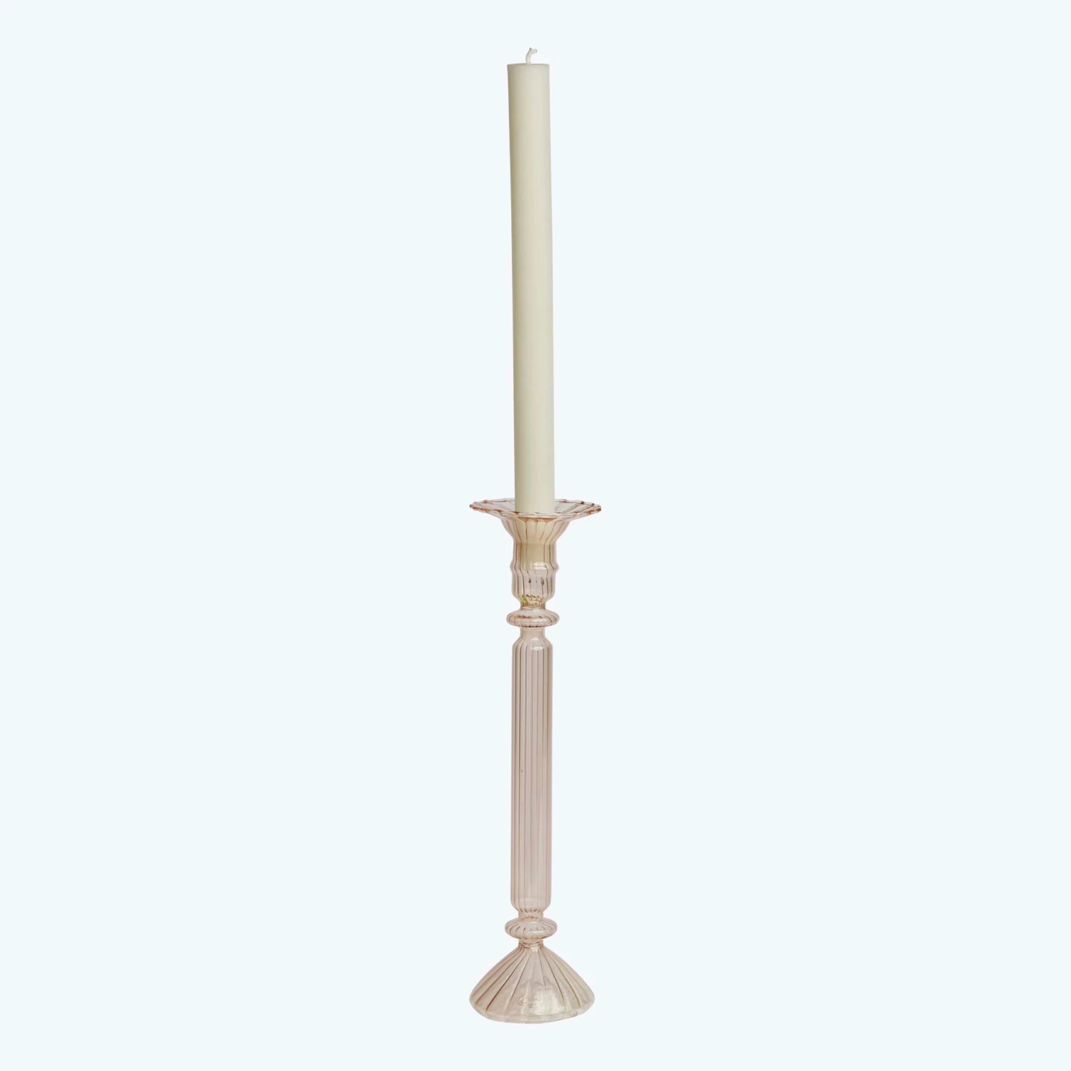 This Roman Column Glass Candlestick pairs perfectly with enchanting table settings for every season. This glass taper candlestick is blown in a sophisticated Roman column shape with a light pink tint. A beautiful addition to your bookshelf, coffee table, or entryway display.