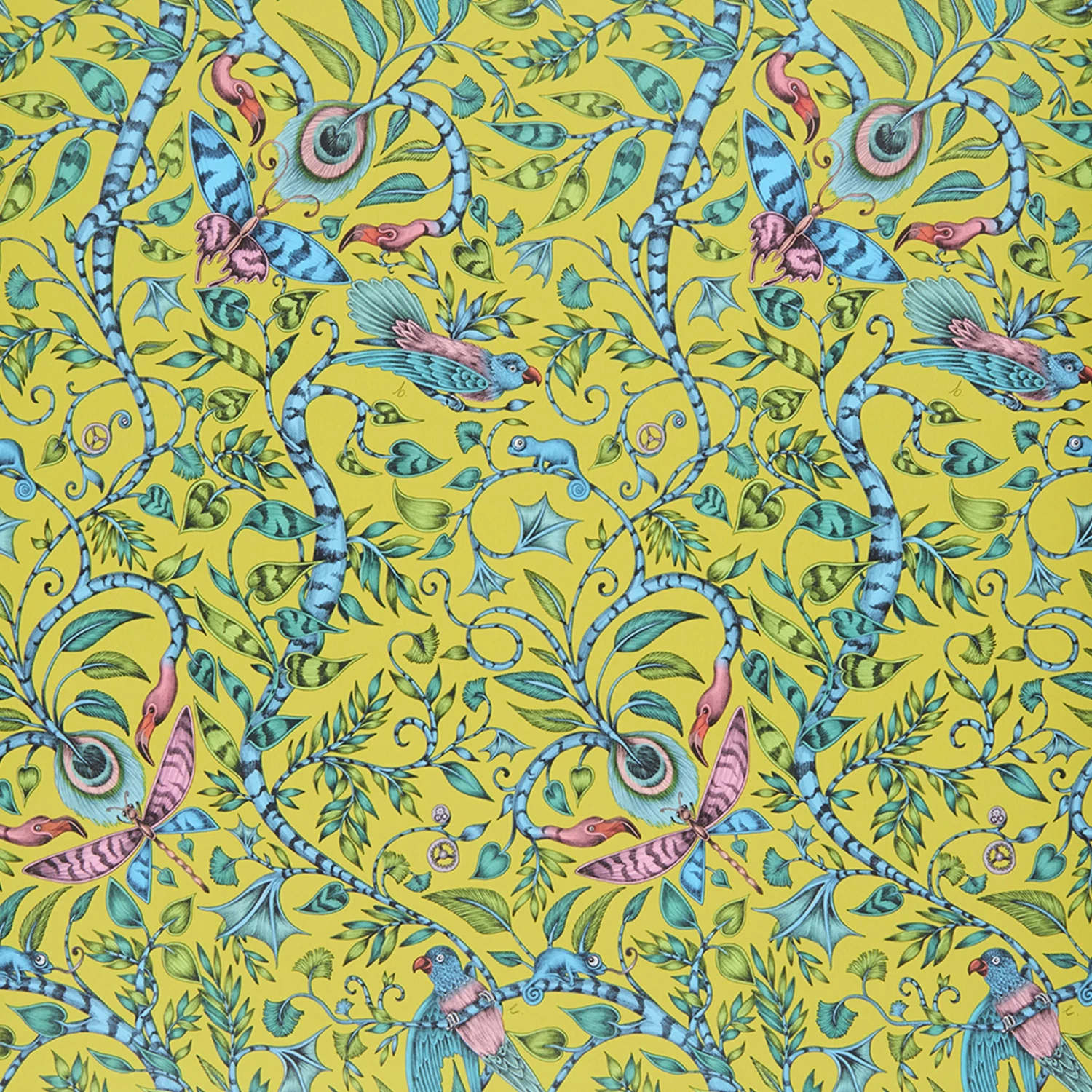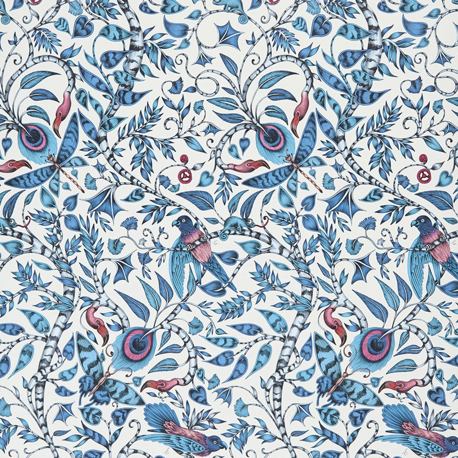 Made in partnership with interior design experts Clarke & Clarke, the Rousseau Wallpaper features an intricately hand-drawn pattern of winding jungle foliage, peacock features, and curious birds + creatures in a variety of bold color options with metallic highlights. This magical traditional wallpaper is part of the magical Animalia Collection by British graphic designer Emma J Shipley, specializing in home wallpaper for nature lovers, dreamers, and maximalists that are sure to be treasured for years to come.