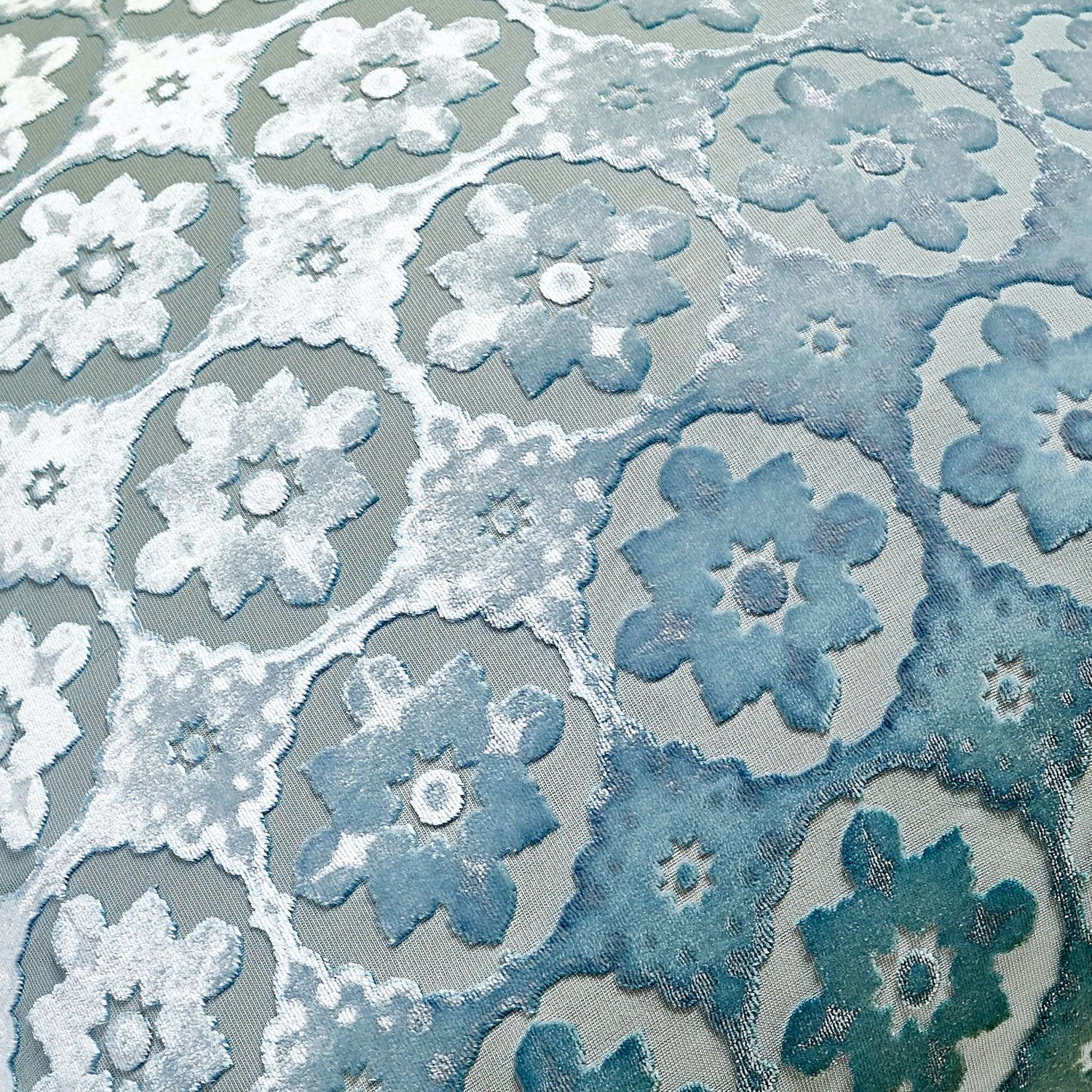 This original design is hand painted on radiant silk velvet to enhance the pillow’s iridescent sheen. The color exudes a clean, contemporary look, while the intricate pattern adds an exotic touch. This design began in Kevin’s sketchbook, was printed on silk velvet, then hand-painted in small batches by artisans in Philadelphia. Dye is applied by hand in layers on the velvet fiber surface. Variations in color are part of the nature of their unique dying process.