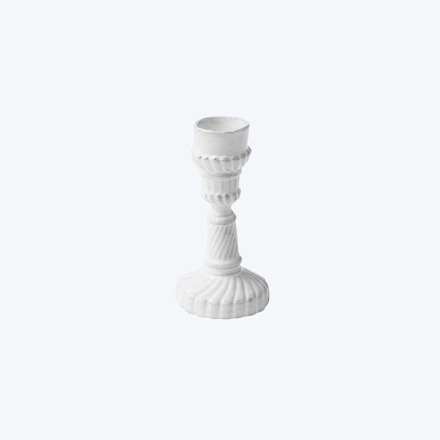 The Peggy candlestick interprets the lines of a scallop seashell for a formal yet beachy aesthetic. Hand molded from black terracotta, each piece is finished in a milky-white glaze that highlights the unique character of the clay, celebrating its imperfections and ensuring that no two pieces are exactly alike. Romantically bohemian, yet practical for everyday use, these pieces are made in an antique Bastille workshop, historically home to Napoleon Bonaparte’s own silversmith.