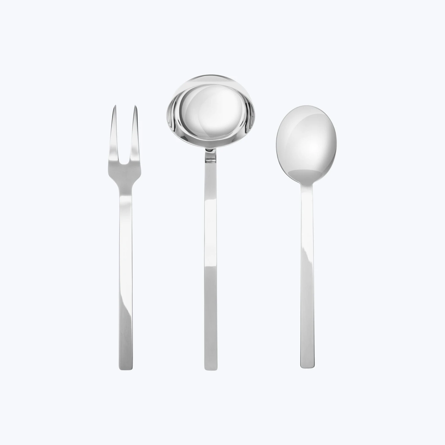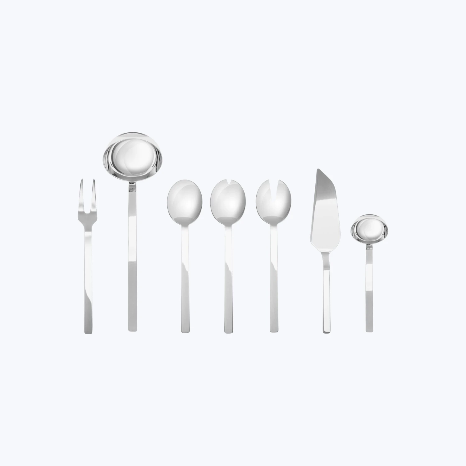 7 Piece Full Serving Set includes (1) Serving Fork, (1) Serving Spoon, (1) Salad Serving Fork, (1) Salad Serving Spoon, (1) Soup Ladle, (1) Gravy Ladle, and (1) Cake Server