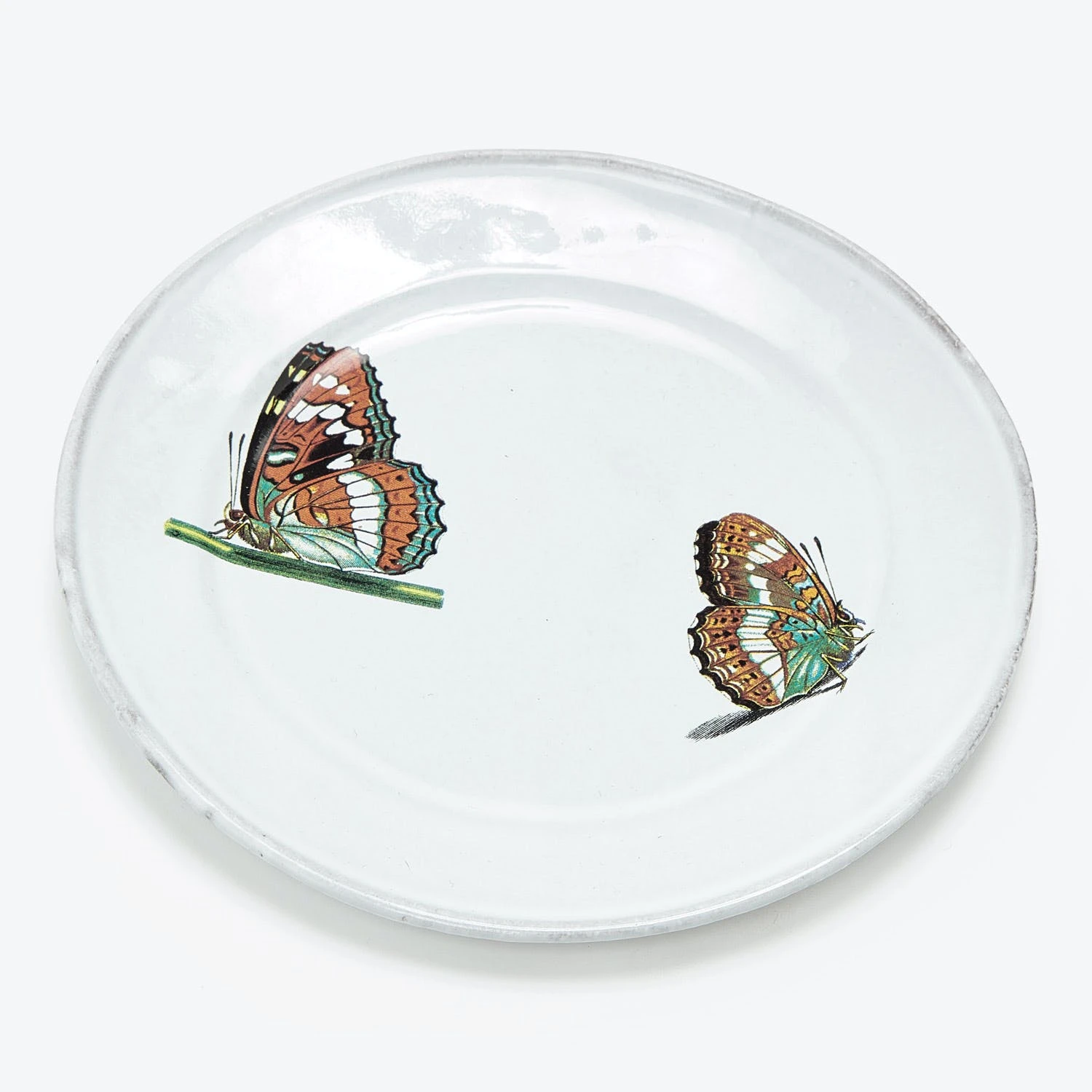 Handmade on Rue St. Honore in Paris, these 18th-century inspired ceramics are crafted in a traditional pottery style passed down from generations. Hand molded from black terracotta, each piece is finished in a milky-white glaze that highlights the unique character of the clay, celebrating its imperfections and ensuring that no two pieces are exactly alike. Emblazoned with the iconic work of decoupage artist John Derian, this ceramic plate showcases the visually stimulating beauty of nature through colorful butterfly imagery.