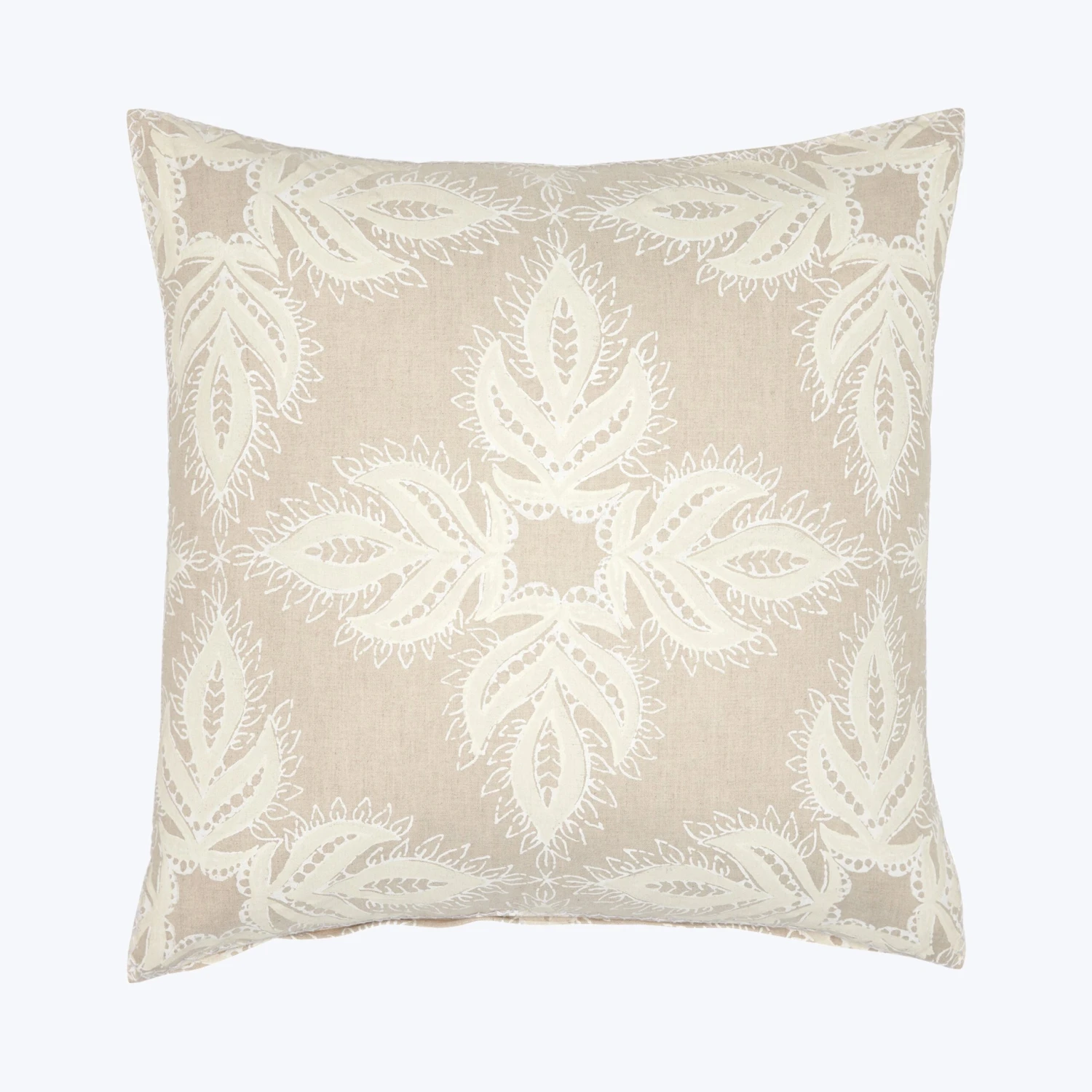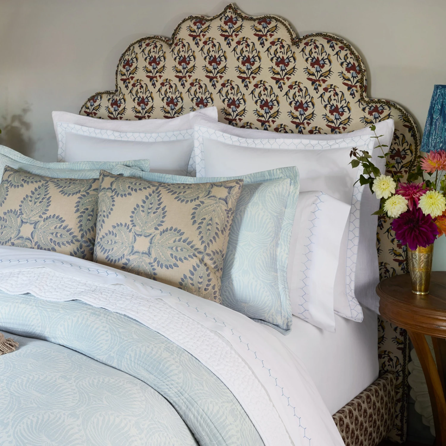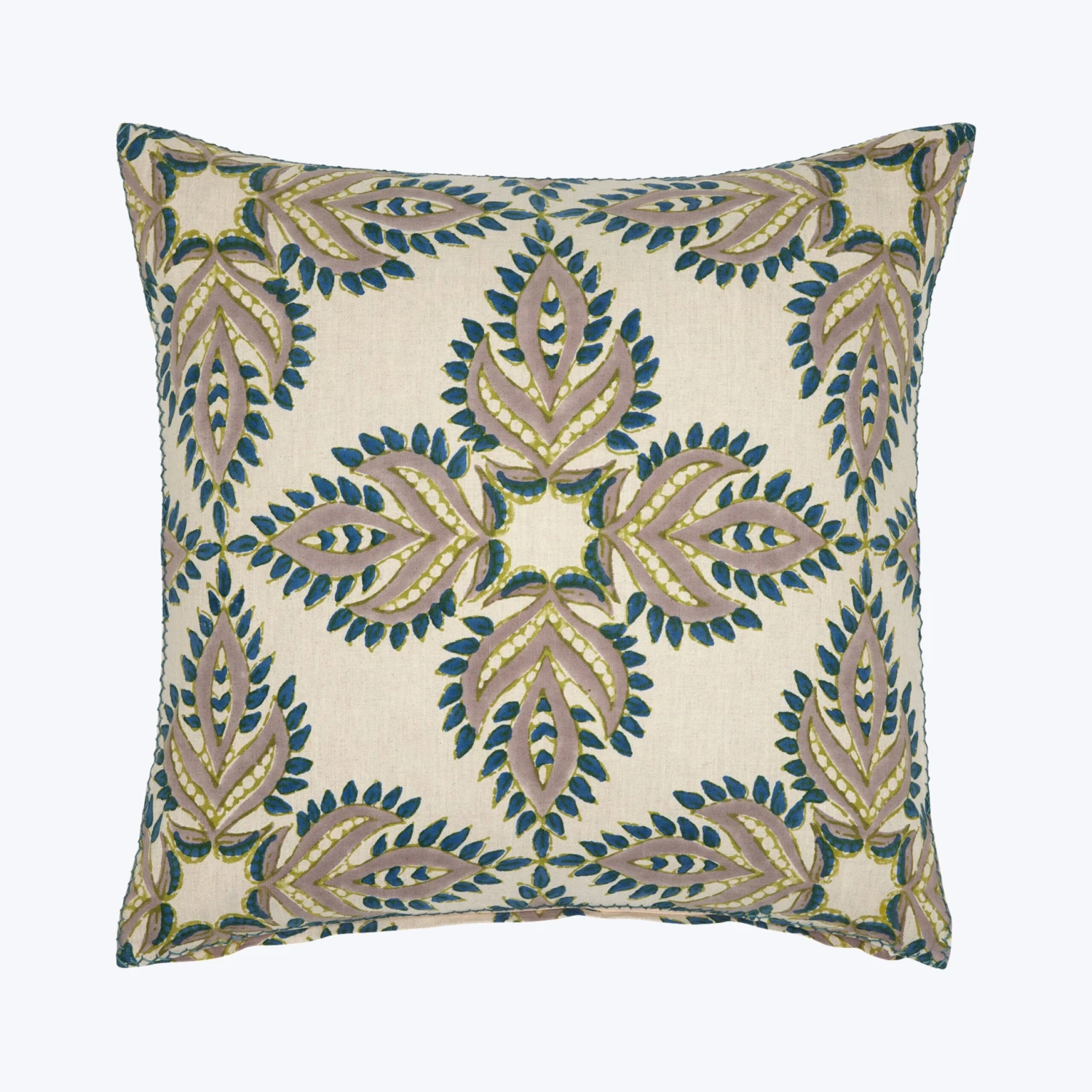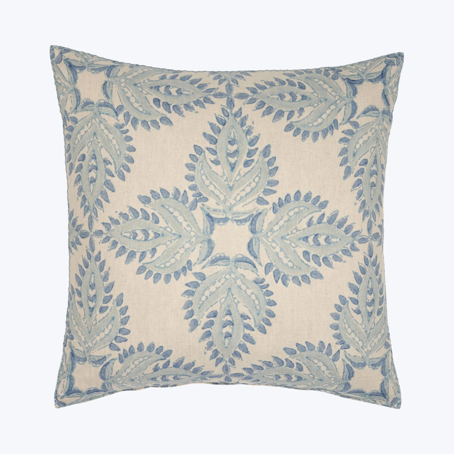 The Verdin Decorative Pillow features an elegant print that evokes the nazar, an eye-shaped symbol that protects against evil. The design is hand block printed on cotton linen, and the elegant edging is hand stitched in a calming blue hue. Featuring a distinct balance of bold and bright from old-world traditions and new-world style, John Robshaw displays an updated spin on traditional, handmade textiles with a vibrant mix of sophistication and romantic allure. Dying, printing, and experimenting alongside the artisans to create these unique fabrics, John Robshaw helps preserve traditional block printing, hand-stitching, hand-painting, and hand-quilting textiles in India.