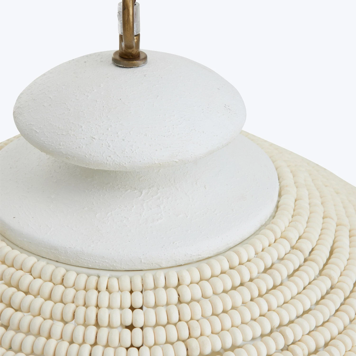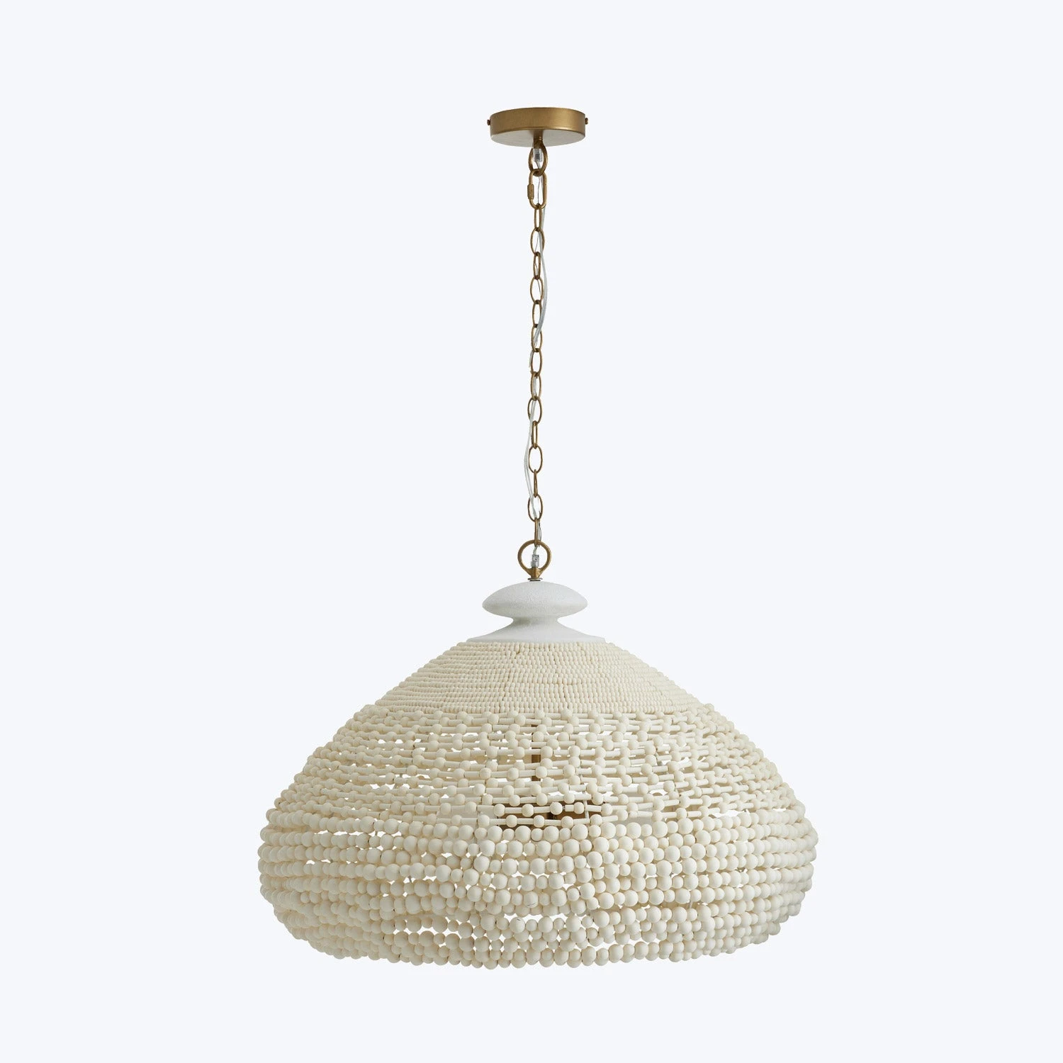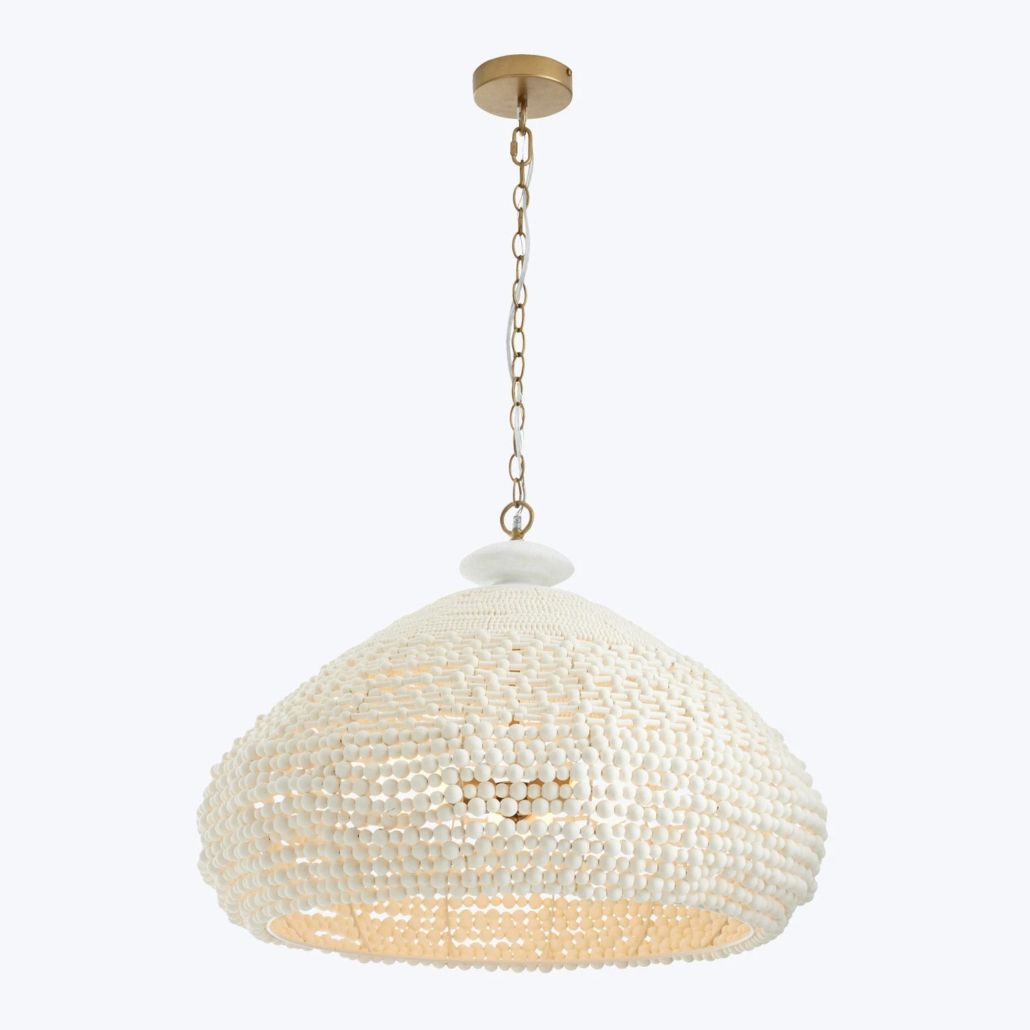 This chandelier contrasts its traditional form with unique natural materials. The shallow but wide bell-shaped silhouette of the shade is constructed of white wooden beads, and suspended by an antique brass iron chain. Rustic yet modern, the unique, low-profile construction rich texture to modern spaces. A wide disc-shaped finial tops the shade for a matching textural accent.