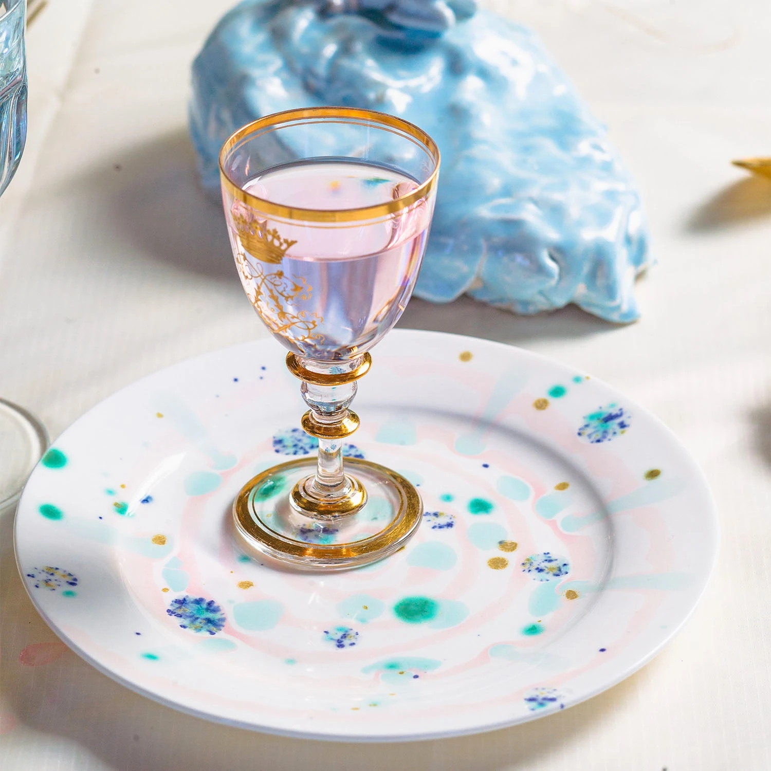 Truly unique, the Winter Dessert Rim Plate evokes details of the season with soft pink, pale blues, and light green backgrounds with emerald-colored spots that decorate the delicate surface representing a myriad of snowflakes. Inspired by the seasons, the Winter Dinnerware Collection showcases the ambiance of the frost-filled season on your table. Originating from Italy, Coralla Maiuri is a world-renowned artist who creates hand-crafted dinnerware and home decor inspired by natural elements.